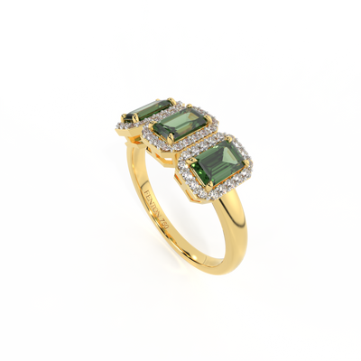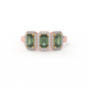 This low set, super wearable beauty, is reminiscent of a floral garland, one of the most universal symbols of love. Three Emerald cut Green Sapphire stones are surrounded by diamond halos, each stone is completely unique.