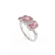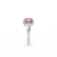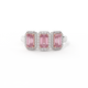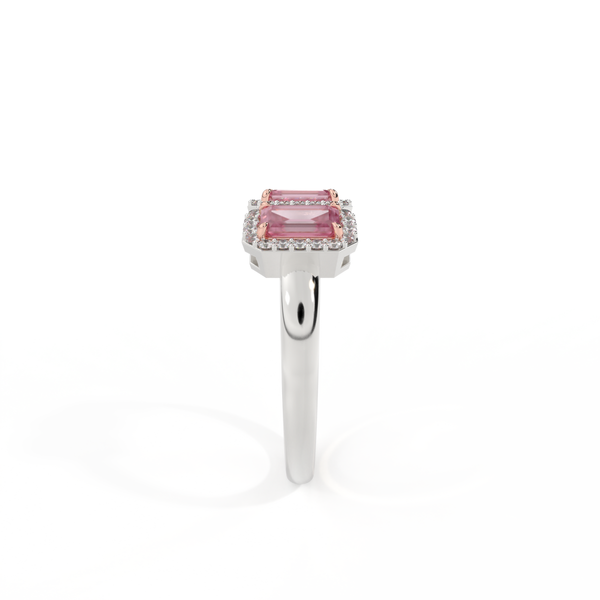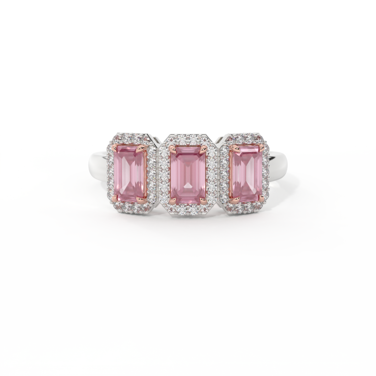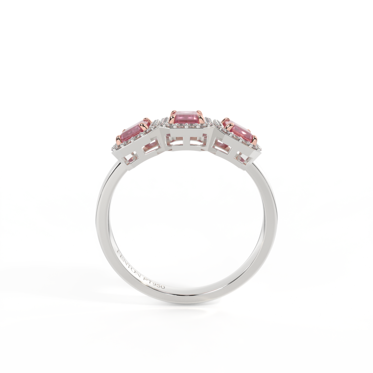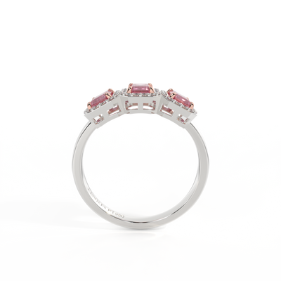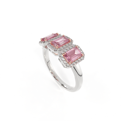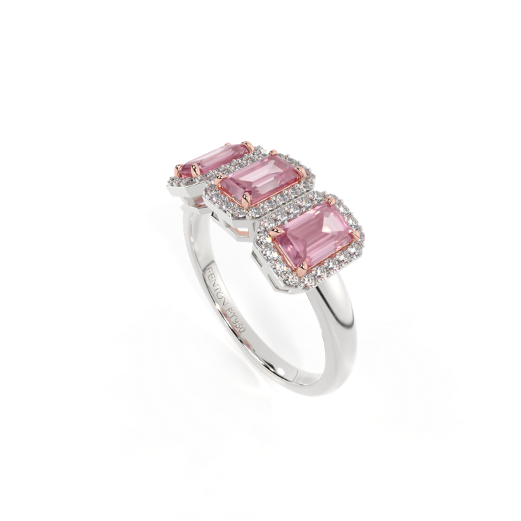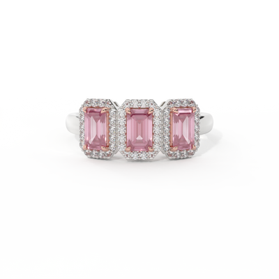 This low set, super wearable beauty, is reminiscent of a floral garland, one of the most universal symbols of love. Three Emerald cut Pink Sapphire stones are surrounded by diamond halos, each stone is completely unique.