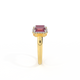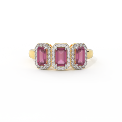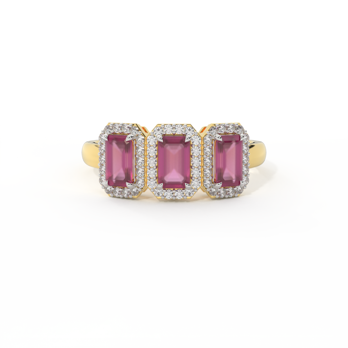 This low set, super wearable beauty, is reminiscent of a floral garland, one of the most universal symbols of love. Three Emerald cut Ruby stones are surrounded by diamond halos, each stone is completely unique.