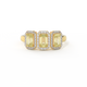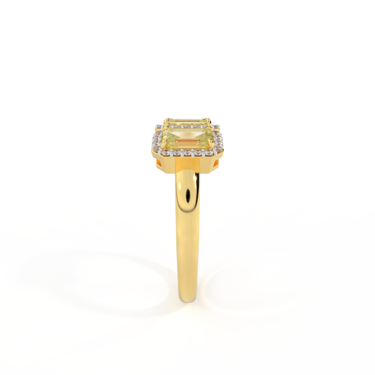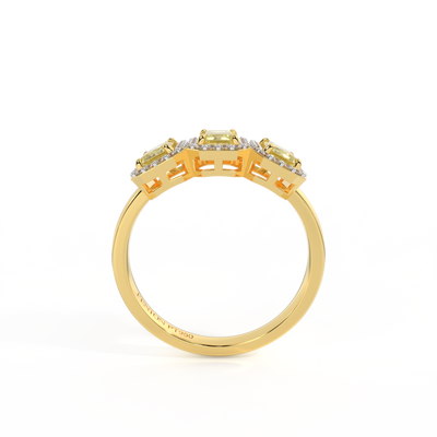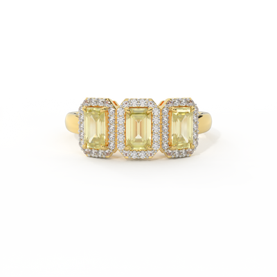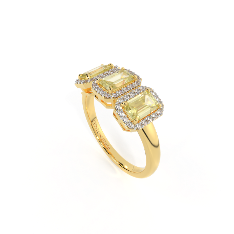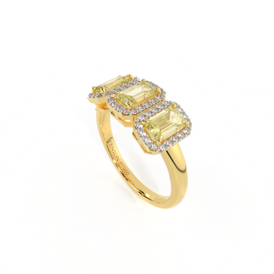 This low set, super wearable beauty, is reminiscent of a floral garland, one of the most universal symbols of love. Three Emerald cut Yellow Sapphire stones are surrounded by diamond halos, each stone is completely unique.