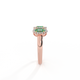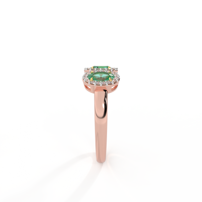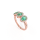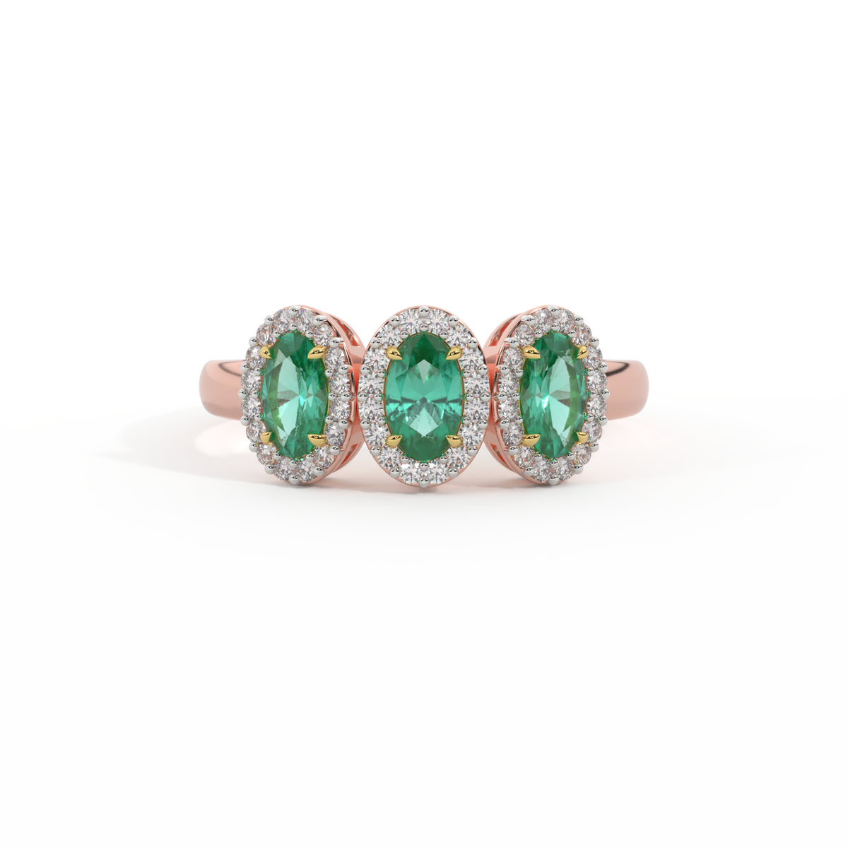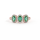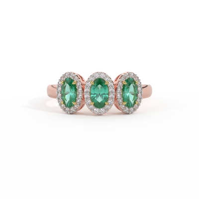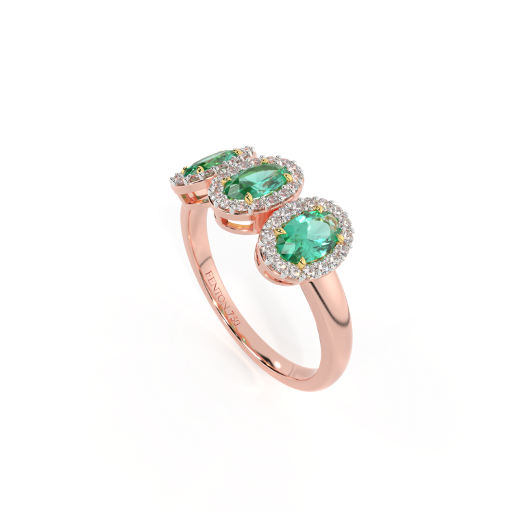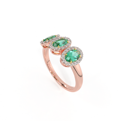 This low set, super wearable beauty, is reminiscent of a floral garland, one of the most universal symbols of love. Three Oval cut Emerald stones are surrounded by diamond halos, each stone is completely unique.