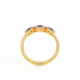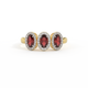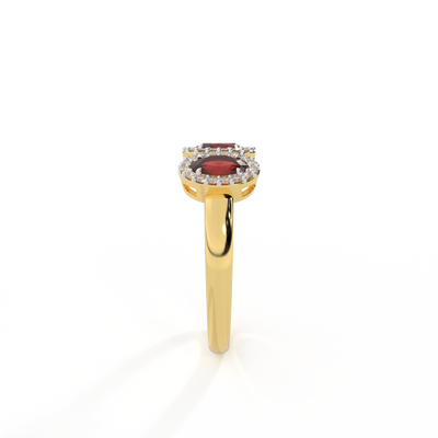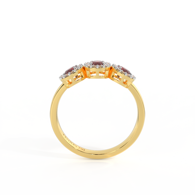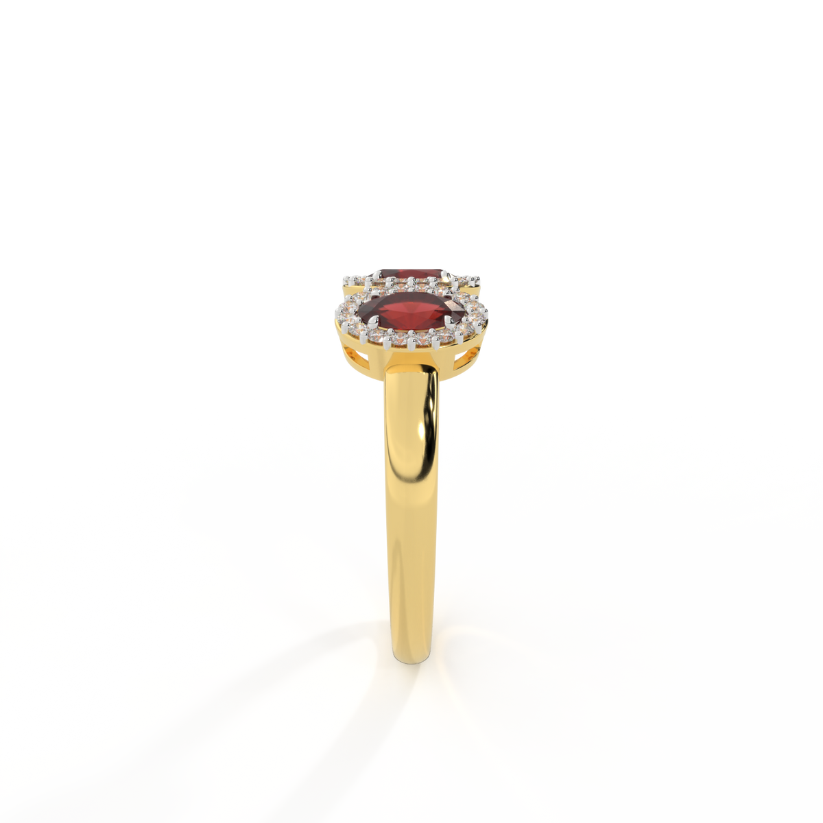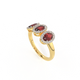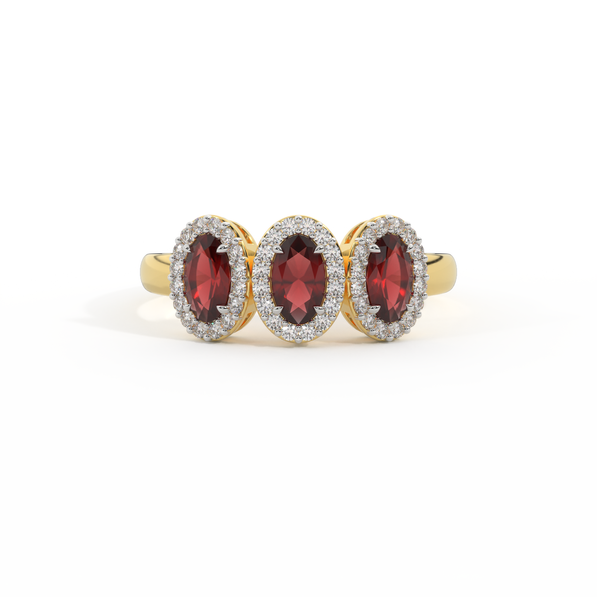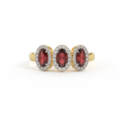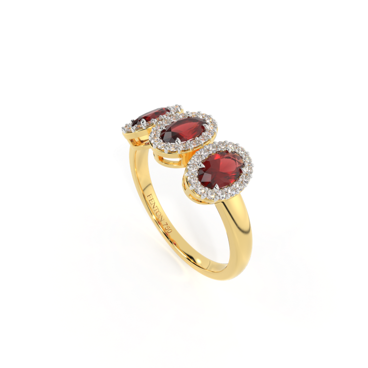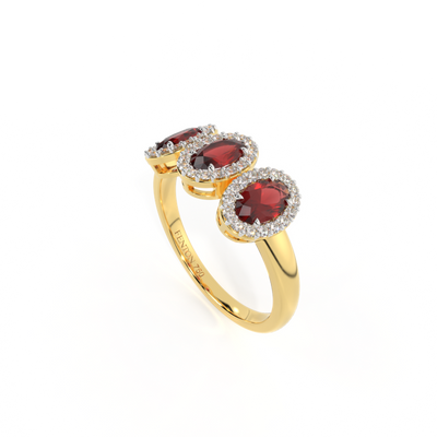 This low set, super wearable beauty, is reminiscent of a floral garland, one of the most universal symbols of love. Three Oval cut Garnet stones are surrounded by diamond halos, each stone is completely unique.
