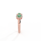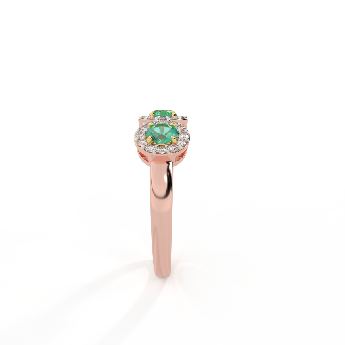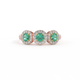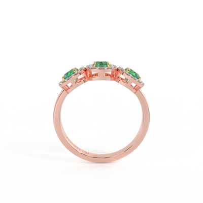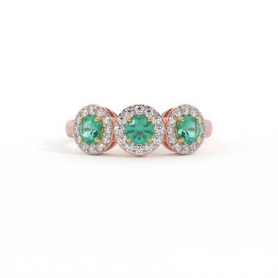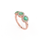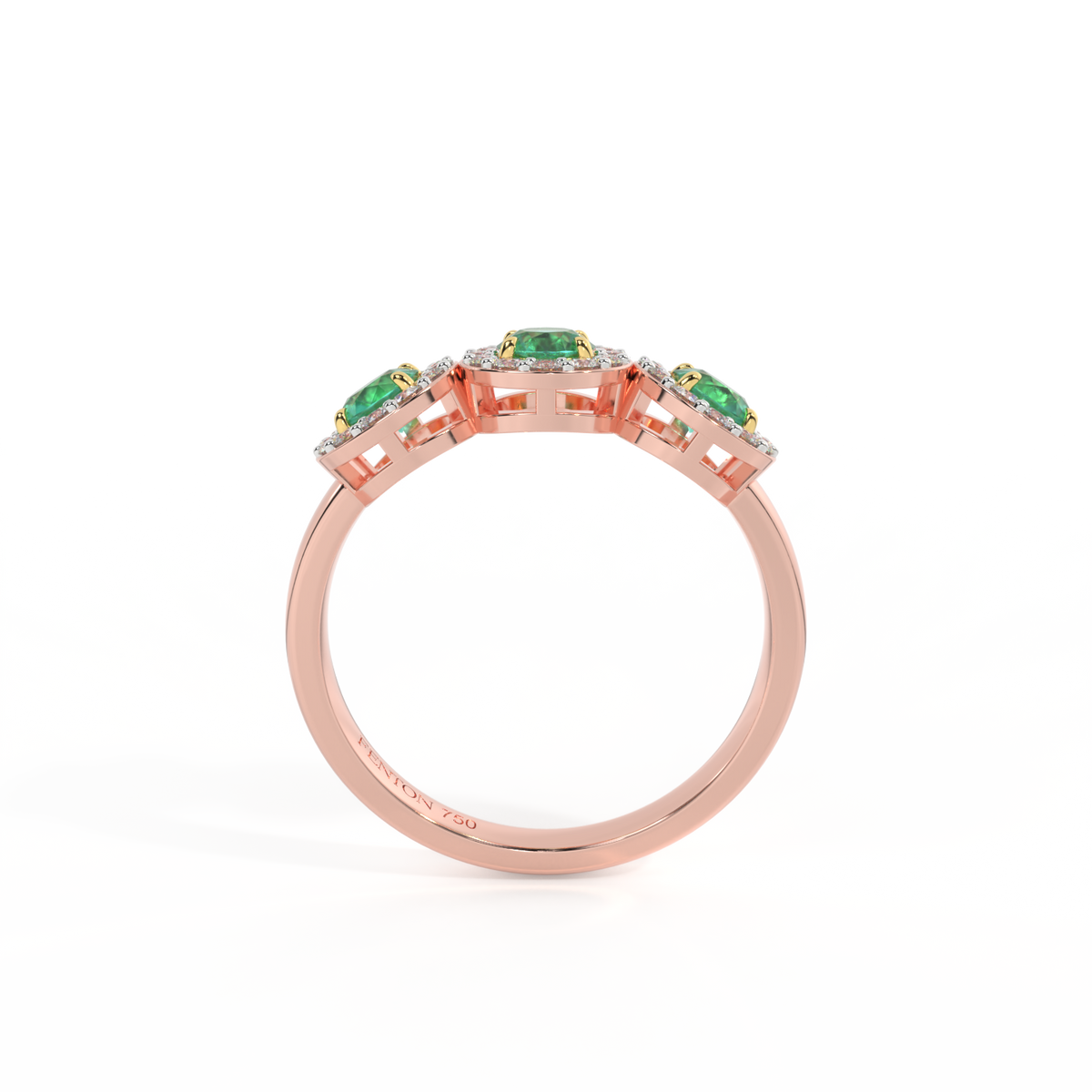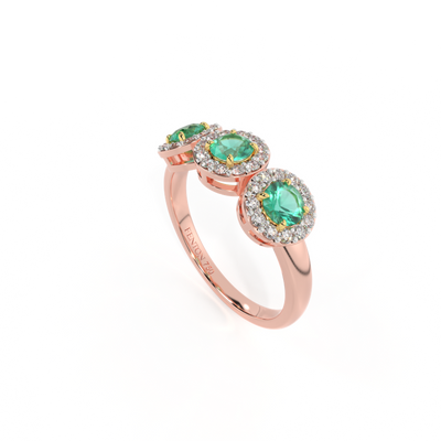This low set, super wearable beauty, is reminiscent of a floral garland, one of the most universal symbols of love. Three Round cut Emerald stones are surrounded by diamond halos, each stone is completely unique.