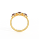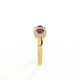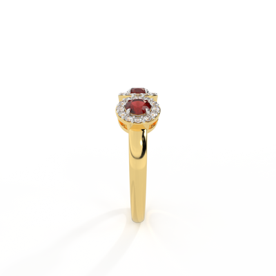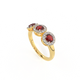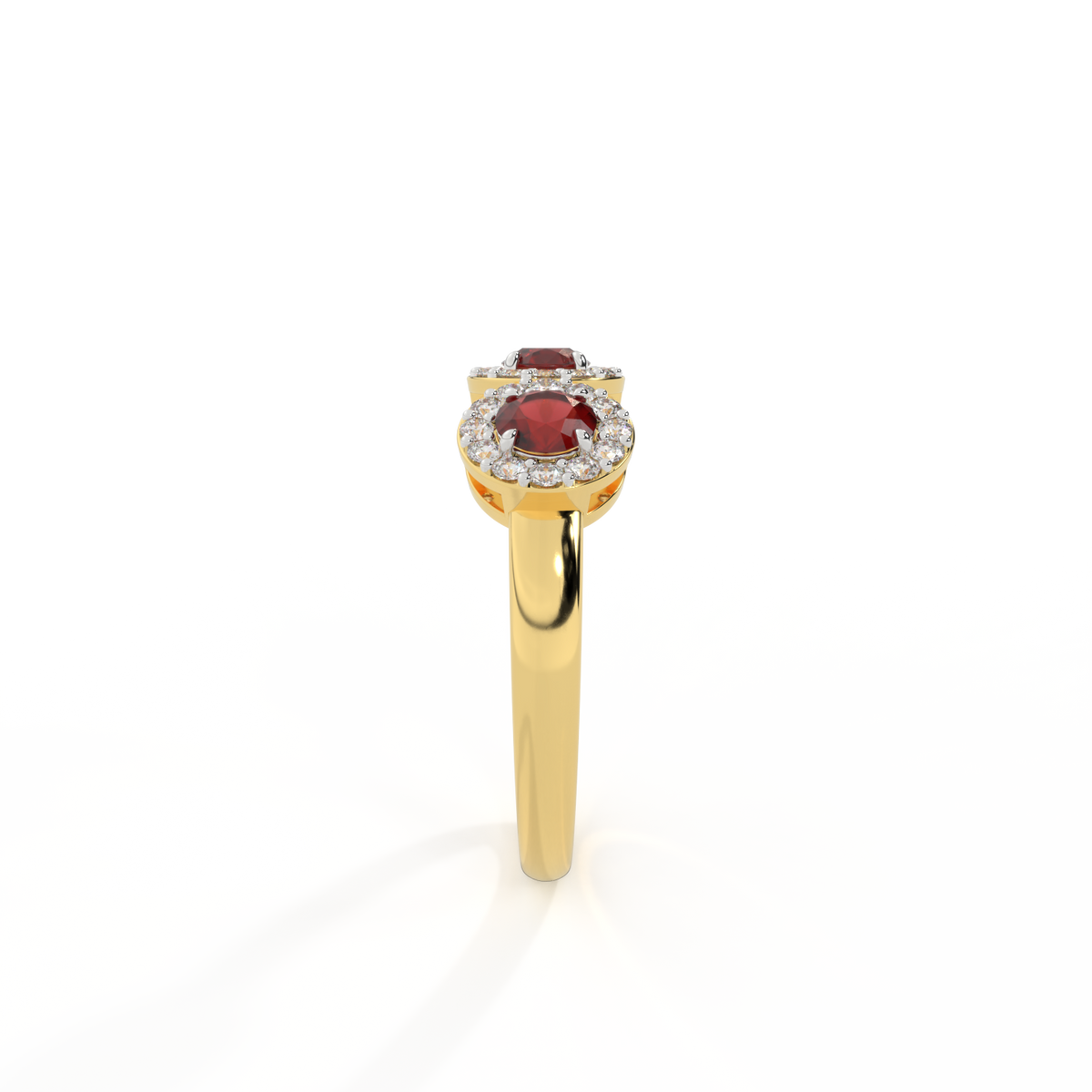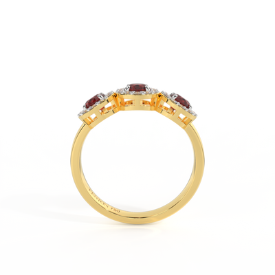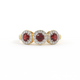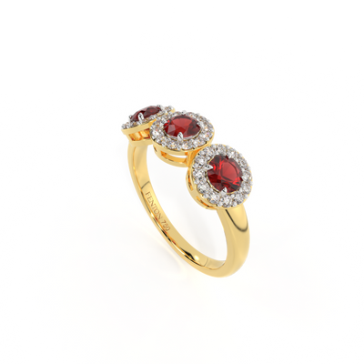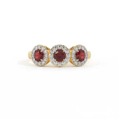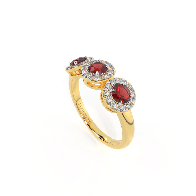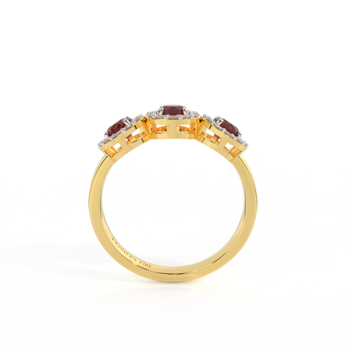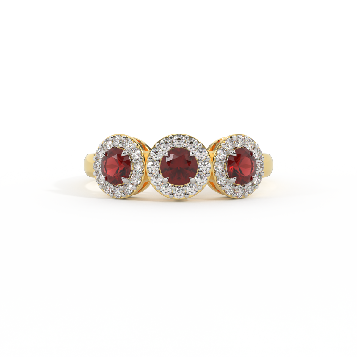 This low set, super wearable beauty, is reminiscent of a floral garland, one of the most universal symbols of love. Three Round cut Garnet stones are surrounded by diamond halos, each stone is completely unique.