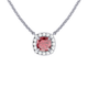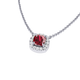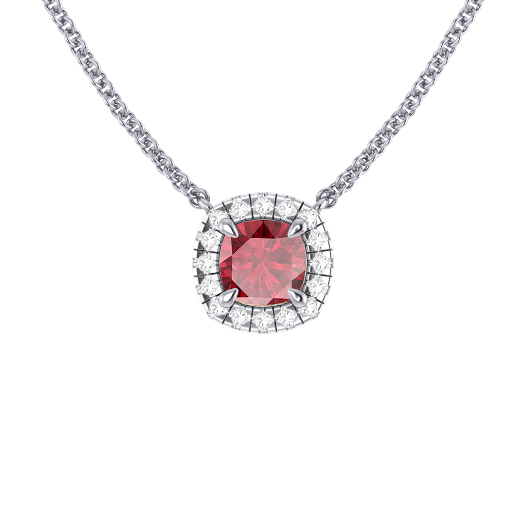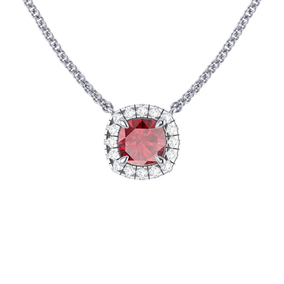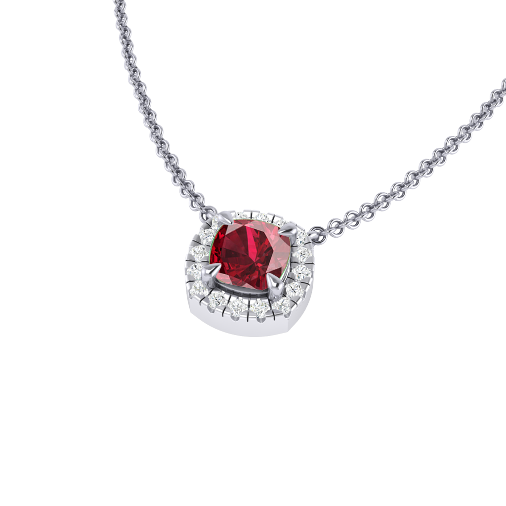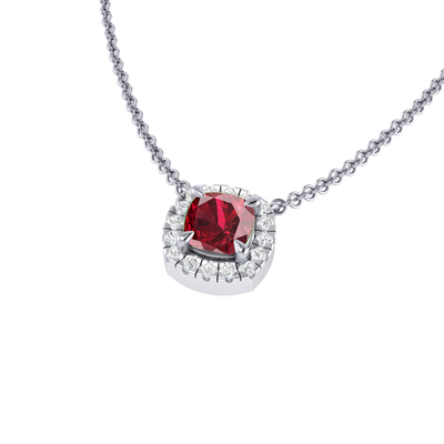 The Halo Necklace is the perfect gift for just about any occasion. A solid 18K White Gold chain securely holds a sparkling Cushion cut Ruby at the center of your necklace surrounded by a halo of round brilliant-cut pavé G/H color and VS clarity diamonds. The Halo Necklace is the perfect combination of finest craftsmanship and understated elegance.