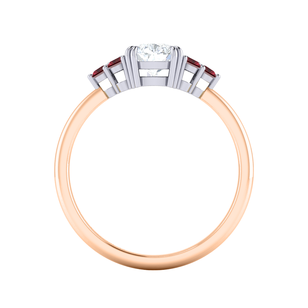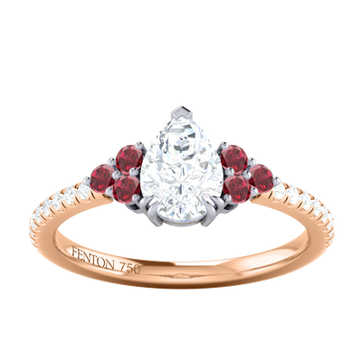 Your glistening undefined Lab Grown Diamond has a EF V/S quality rating and is framed on either side by a trefoil cluster of three 1.8mm round brilliant cut Ruby stones, each securely held into place in a claw setting. The design draws the eye to the glistening Lab Grown Diamond centre stone, sitting proudly in a classic open gallery setting crafted from solid 18K Rose Gold. The open setting of this design allows the light to reflect in all directions, creating a lustrous and sparkling look.