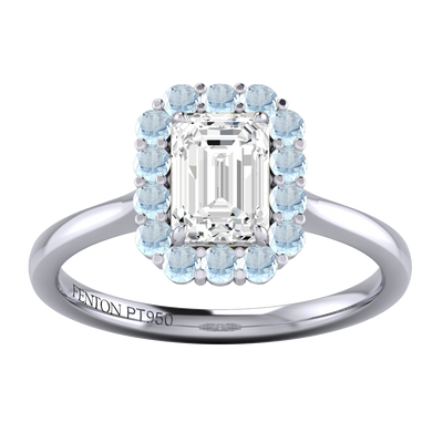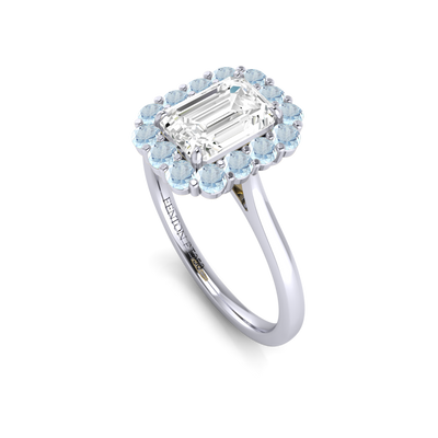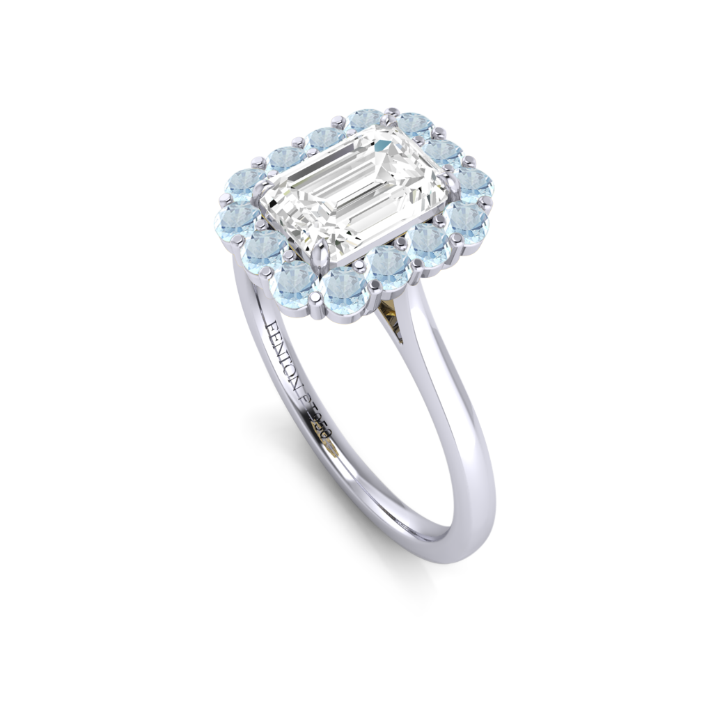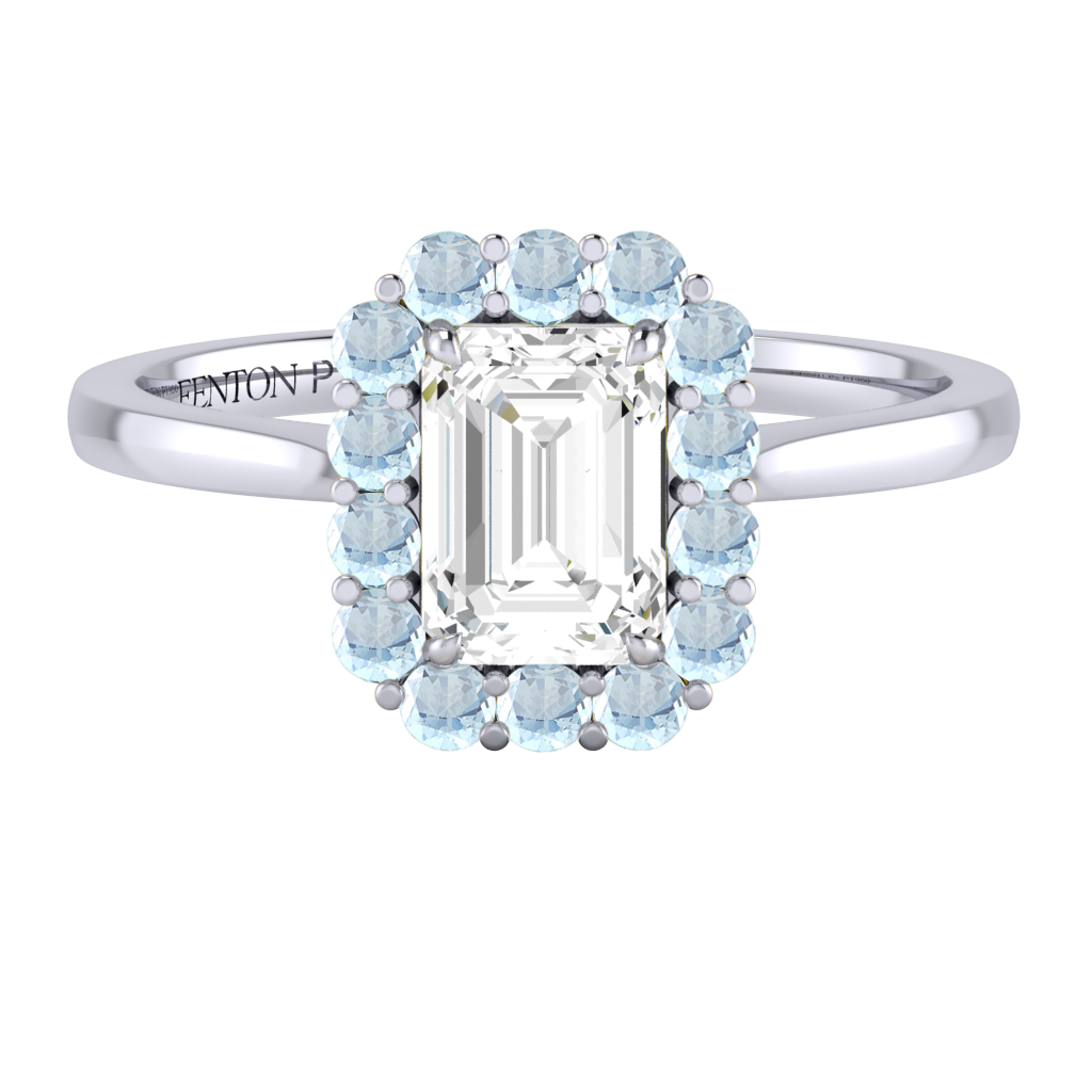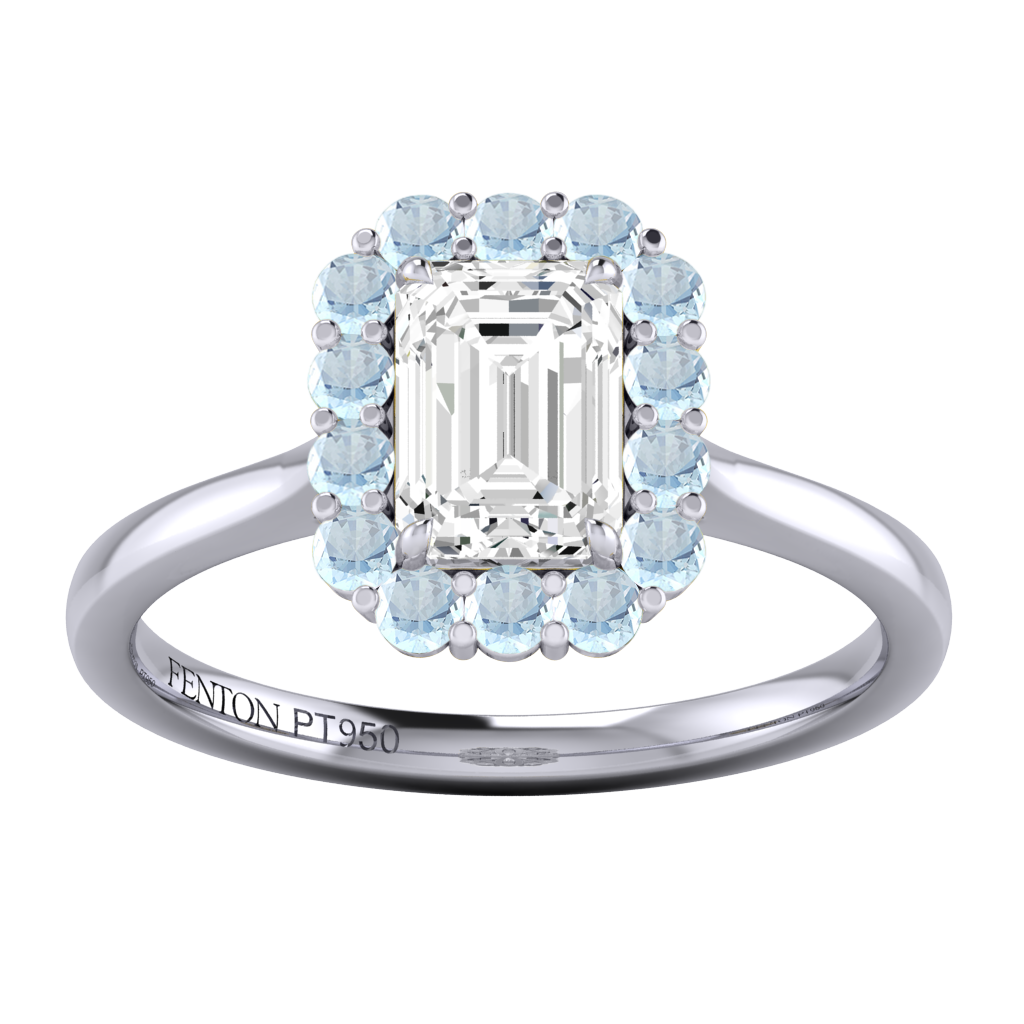 Your sparkling Emerald Naturally Mined Diamond has a GH V/S quality rating and is framed by a halo of twelve brilliant round cut Aquamarine stones. It sits proudly on wedfit cathedral-tapered shoulders to allow it to fit flush with your wedding band. Crafted using solid Platinum with an intricate petal-shaped gallery, this design draws in light to interact and shine through your Naturally Mined Diamond center stone.