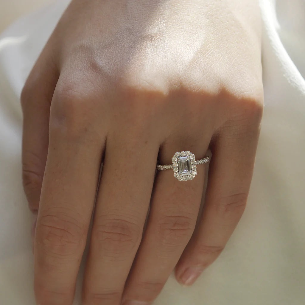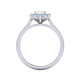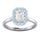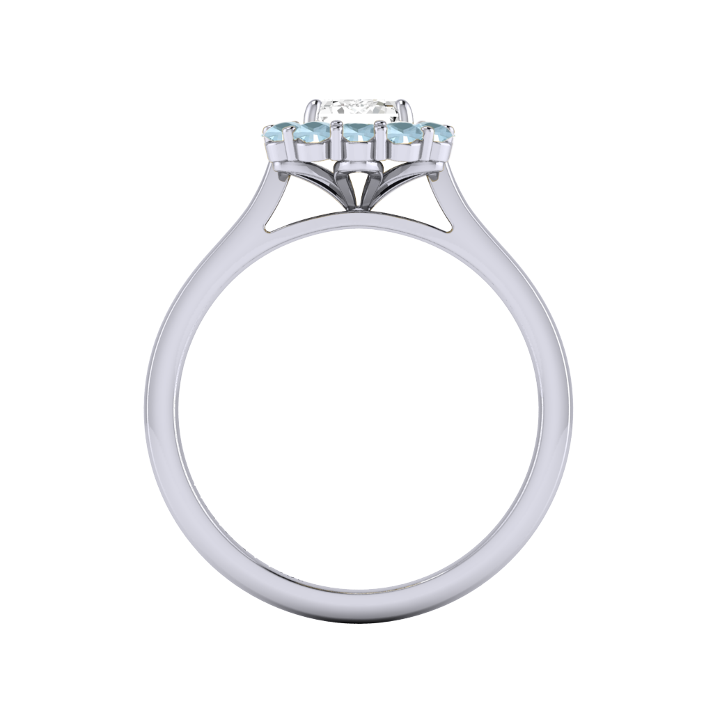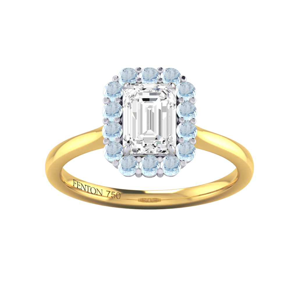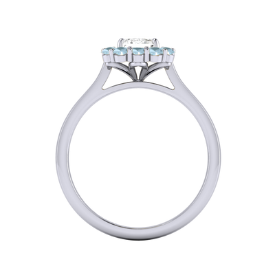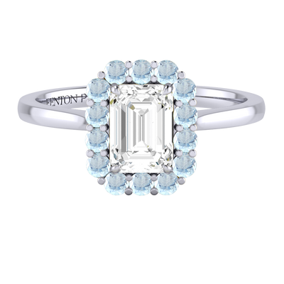 Your sparkling Emerald Naturally Mined Diamond has a GH V/S quality rating and is framed by a halo of twelve brilliant round cut Aquamarine stones. It sits proudly on wedfit cathedral-tapered shoulders to allow it to fit flush with your wedding band. Crafted using solid Platinum with an intricate petal-shaped gallery, this design draws in light to interact and shine through your Naturally Mined Diamond center stone.