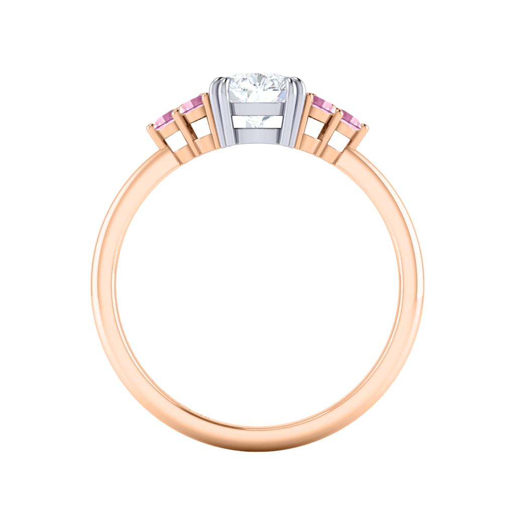 Your glistening undefined Naturally Mined Diamond has a GH V/S quality rating and is framed on either side by a trefoil cluster of three 1.8mm round brilliant cut Pink Sapphire stones, each securely held into place in a claw setting. The design draws the eye to the glistening Naturally Mined Diamond center stone, sitting proudly in a classic open gallery setting crafted from solid 18K Rose Gold. The open setting of this design allows the light to reflect in all directions, creating a lustrous and sparkling look.