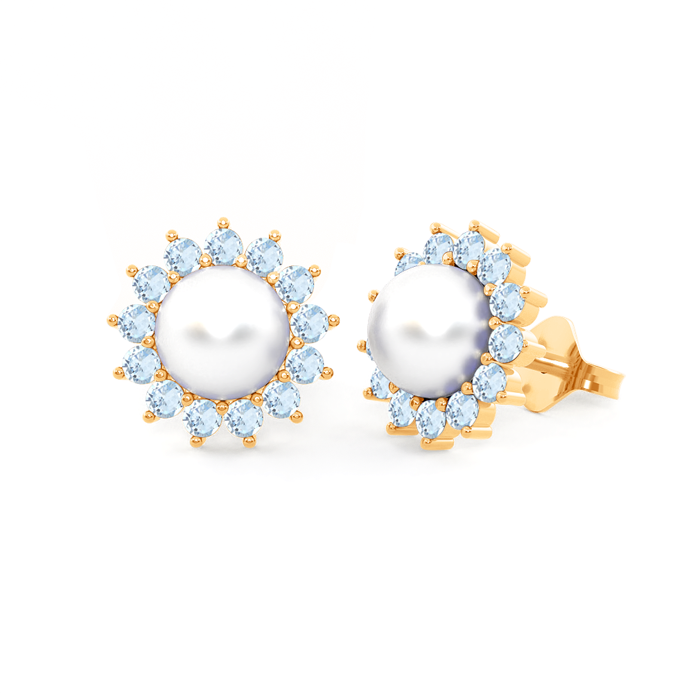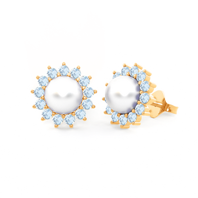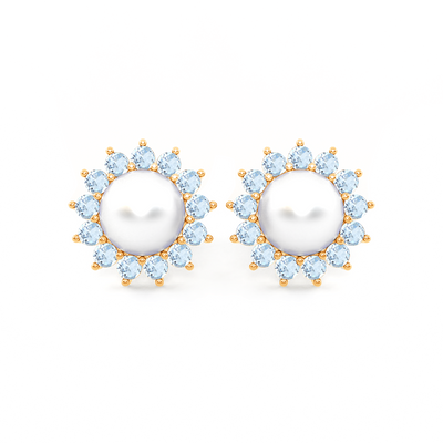 Our Pearl Studs feature a classic freshwater cultured Pearl framed by colourful star-like pave of delicate Aquamarine stones and crafted from solid, recycled 18K Yellow Gold. We love the Pearl Stud Earrings as your colourful Jewelry companion for every day or to gift to someone special. How about combining with a Blue Sapphire or Aquamarine for that special 'Something Blue' moment on your or their wedding day?