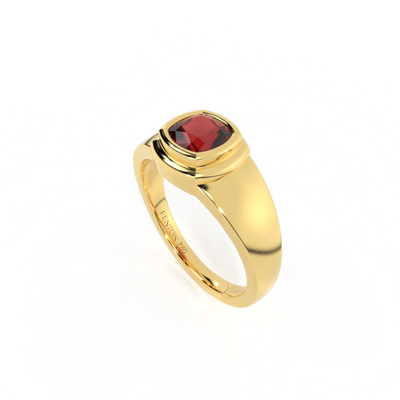 This iconic piece is set with a Cushion cut Garnet, which sits slightly proud above the 18K Yellow Gold band in a stepped bezel setting. The shoulders taper outwards towards the center, with a rounded shank for maximum comfort. A modern heirloom for the everyday.