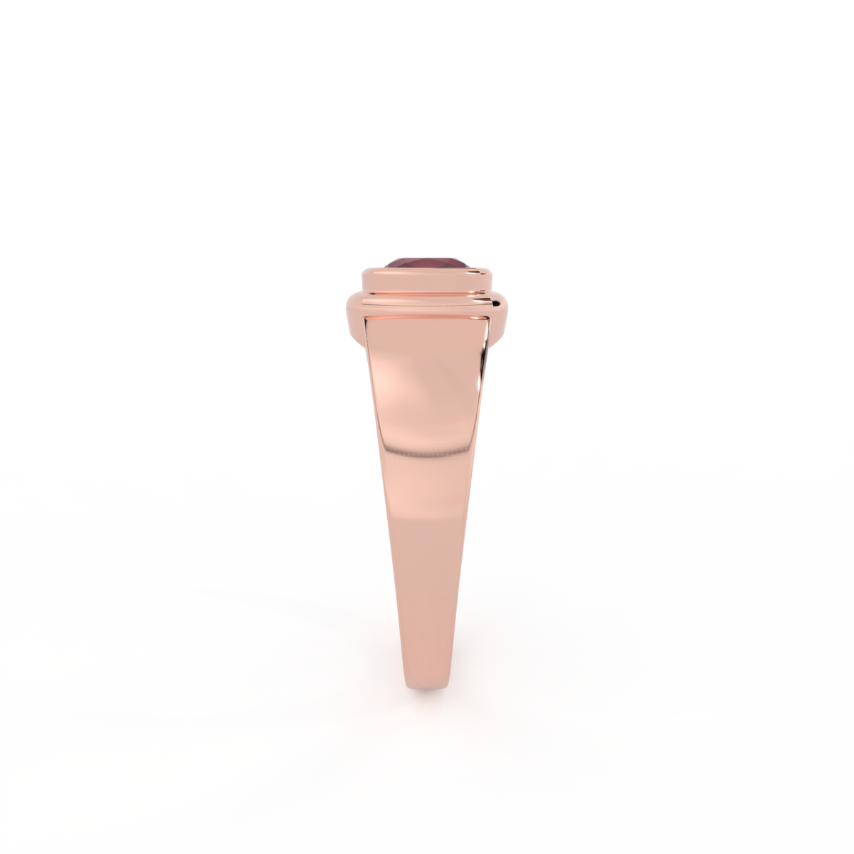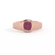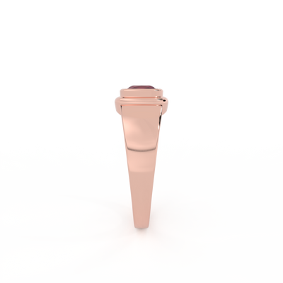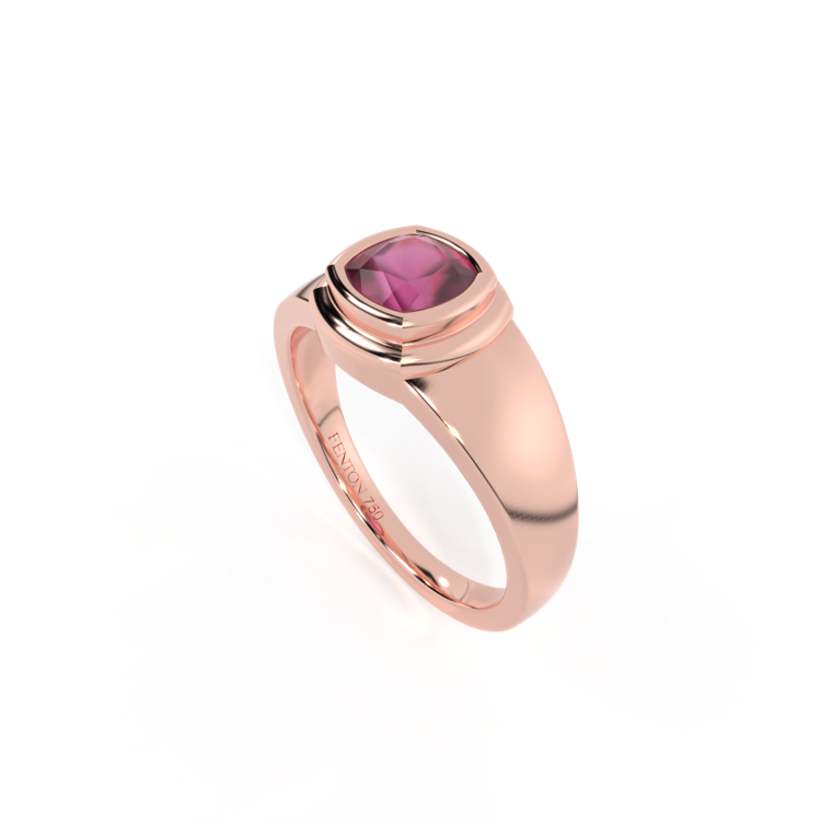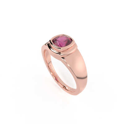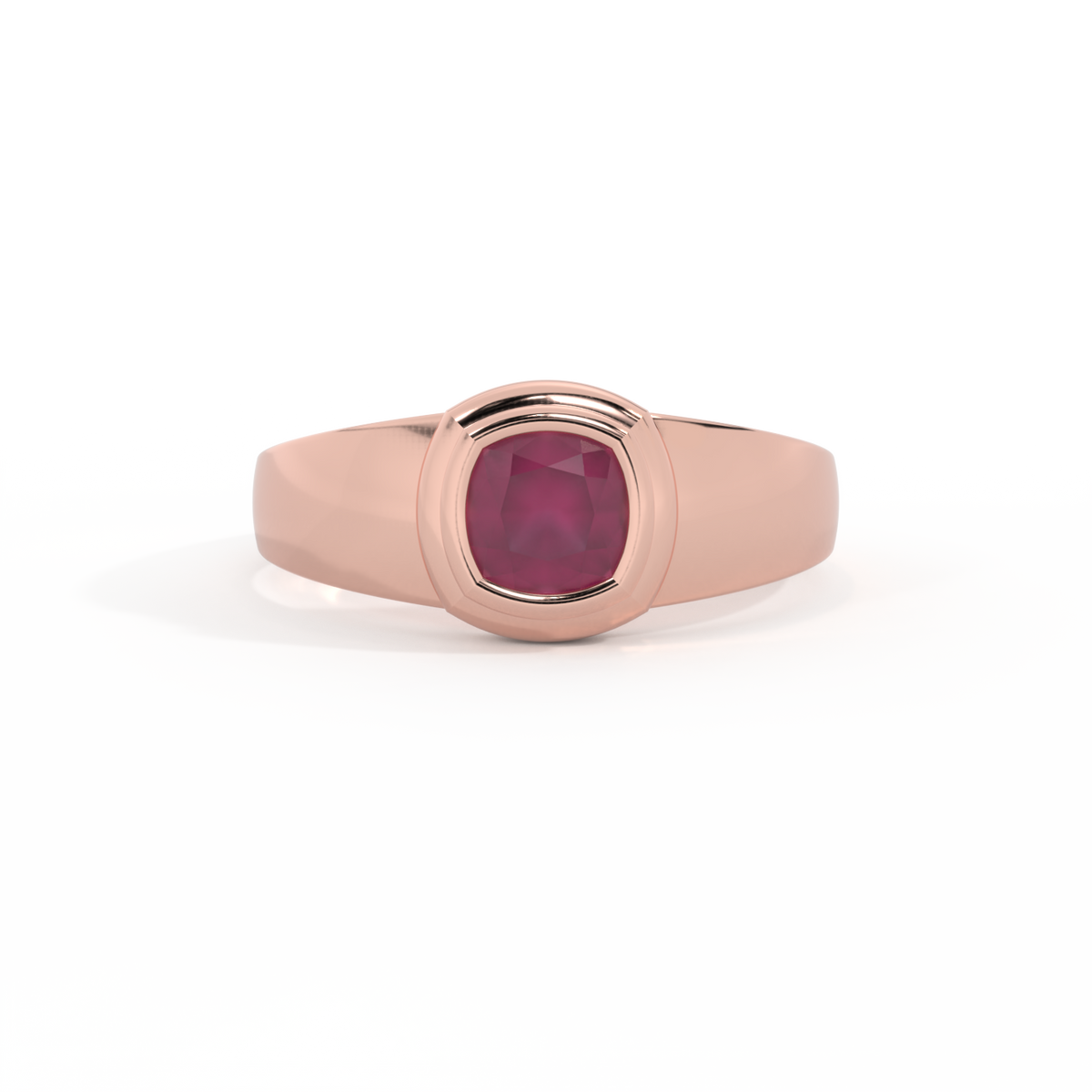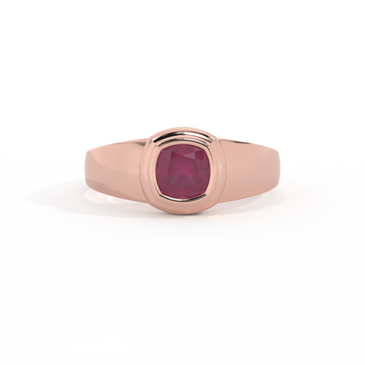 This iconic piece is set with a Cushion cut Ruby, which sits slightly proud above the 18K Rose Gold band in a stepped bezel setting. The shoulders taper outwards towards the center, with a rounded shank for maximum comfort. A modern heirloom for the everyday.