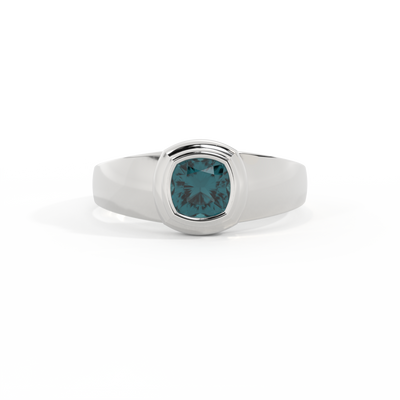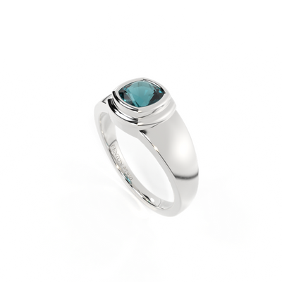 This iconic piece is set with a Cushion cut Teal Sapphire, which sits slightly proud above the 18K White Gold band in a stepped bezel setting. The shoulders taper outwards towards the center, with a rounded shank for maximum comfort. A modern heirloom for the everyday.