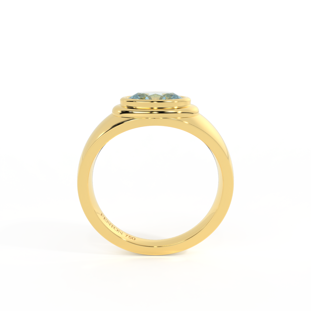 This iconic piece is set with a Oval cut Aquamarine, which sits slightly proud above the 18K Yellow Gold band in a stepped bezel setting. The shoulders taper outwards towards the center, with a rounded shank for maximum comfort. A modern heirloom for the everyday.