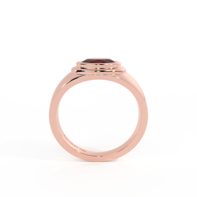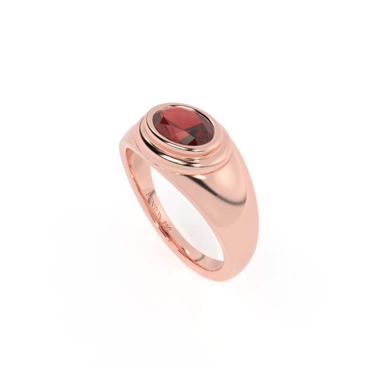 This iconic piece is set with a Oval cut Garnet, which sits slightly proud above the 18K Rose Gold band in a stepped bezel setting. The shoulders taper outwards towards the center, with a rounded shank for maximum comfort. A modern heirloom for the everyday.