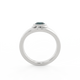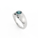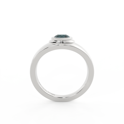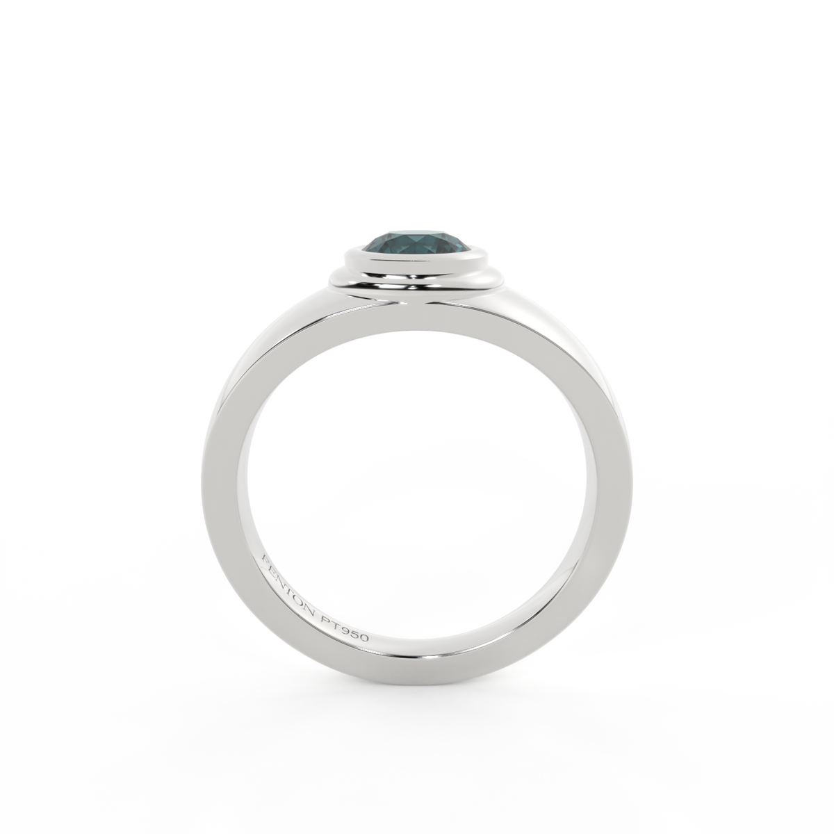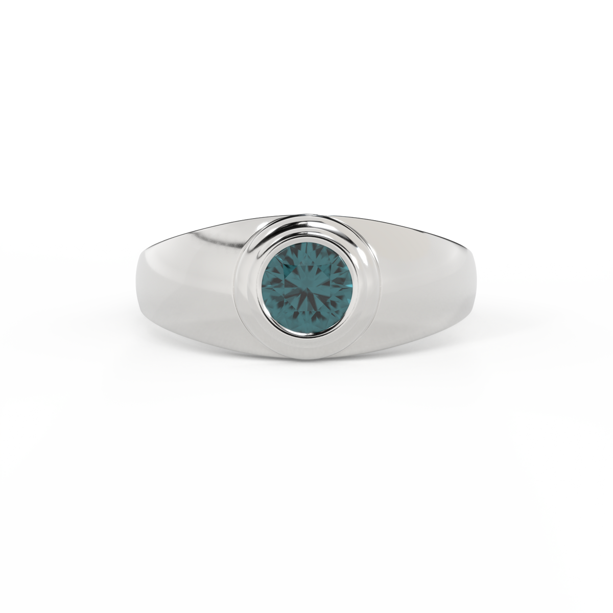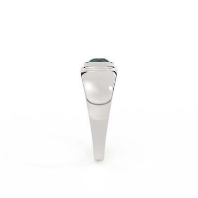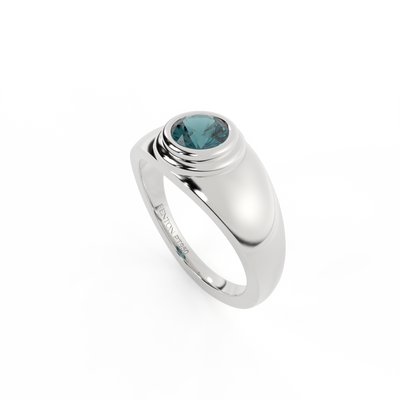 This iconic piece is set with a Round cut Teal Sapphire, which sits slightly proud above the 18K White Gold band in a stepped bezel setting. The shoulders taper outwards towards the center, with a rounded shank for maximum comfort. A modern heirloom for the everyday.