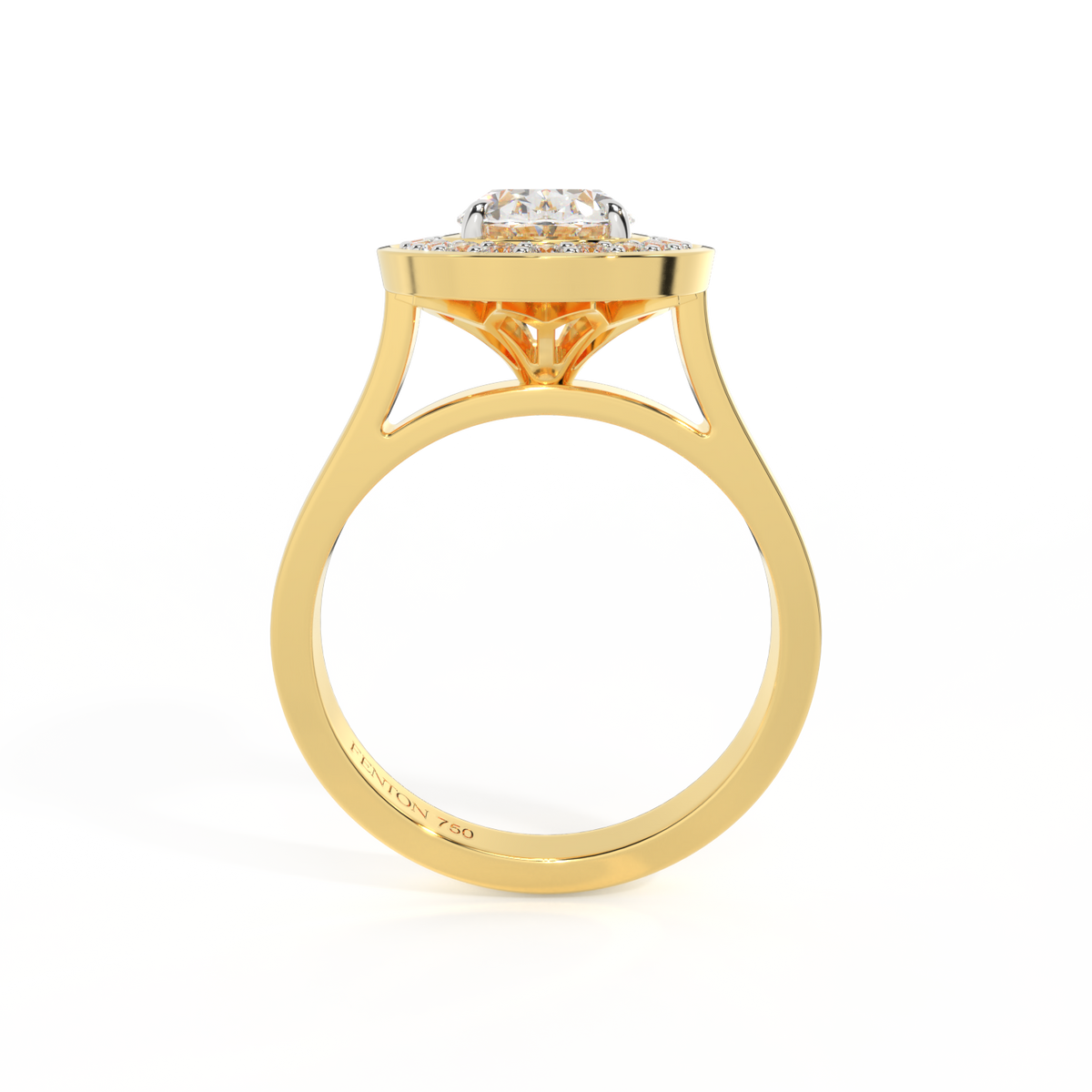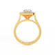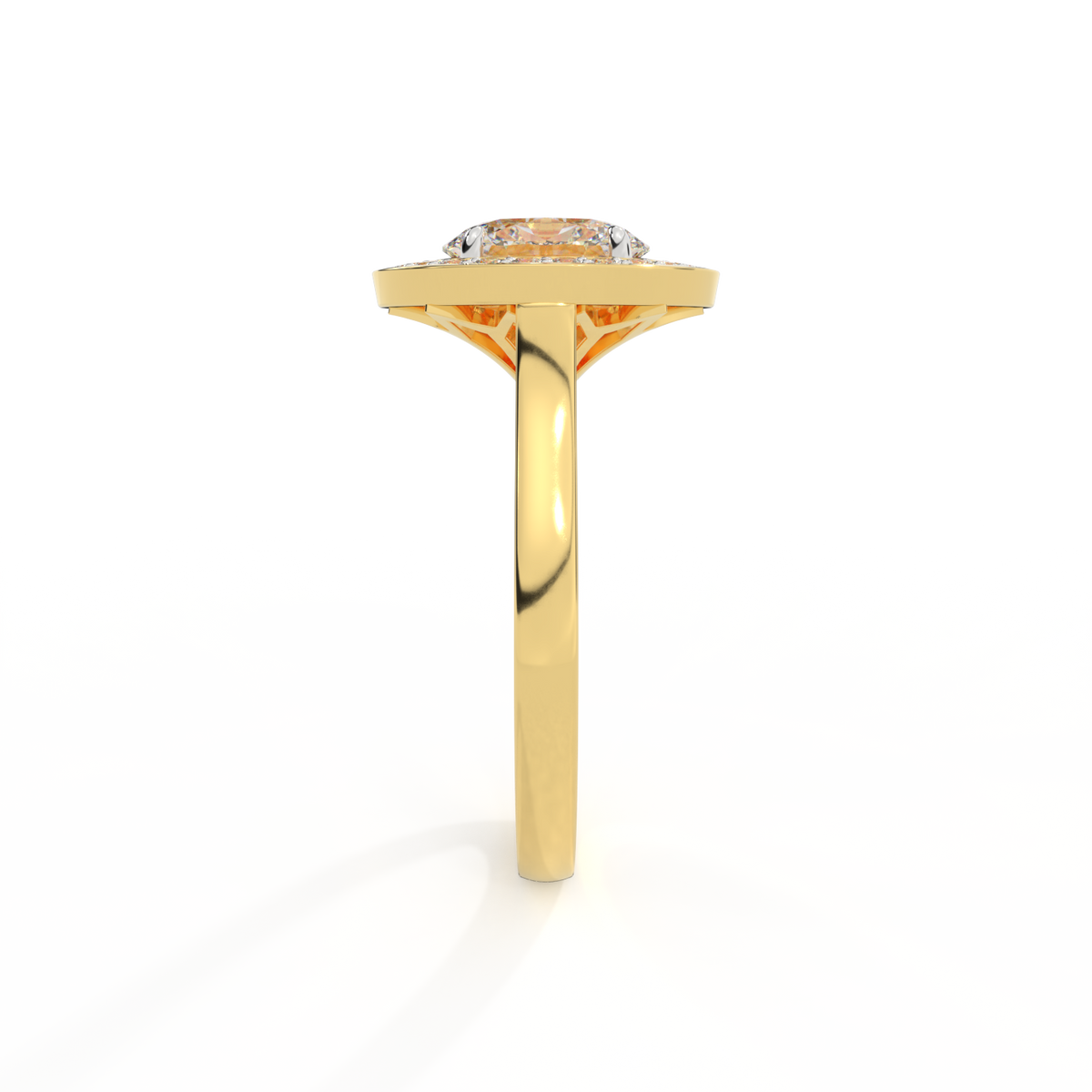 Your sparkling Solar Diamond has a GH V/S quality rating and is framed by a halo of Diamond accent stones and set in bezel style. Your 18K Yellow Gold Solar Diamond center stone sits proudly on wed-fit shoulders to allow your wedding band to sit flush.