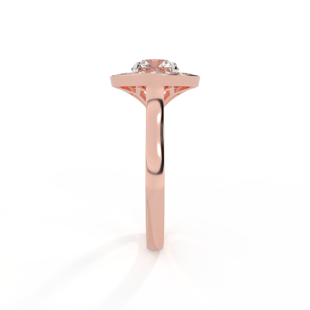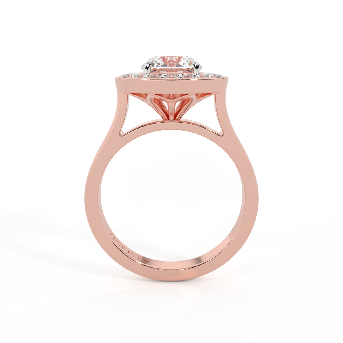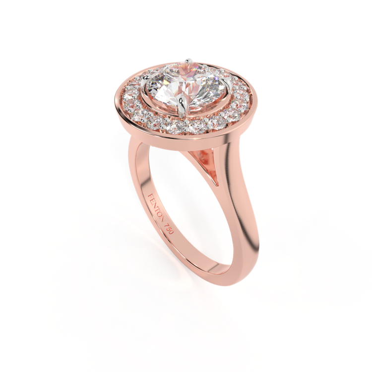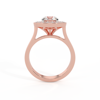 Your sparkling Solar Diamond has a GH V/S quality rating and is framed by a halo of Diamond accent stones and set in bezel style. Your 18K Rose Gold Solar Diamond center stone sits proudly on wed-fit shoulders to allow your wedding band to sit flush.