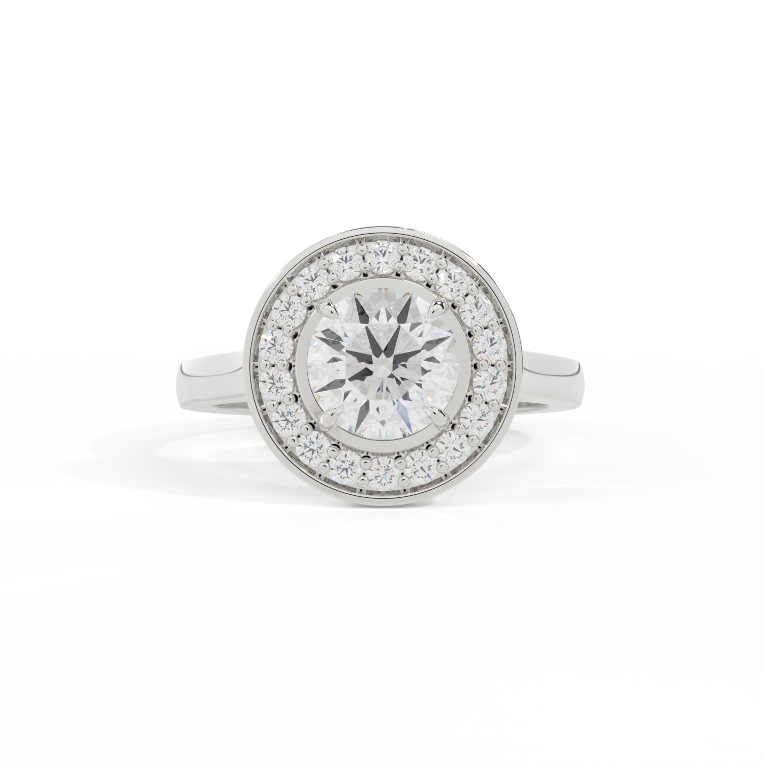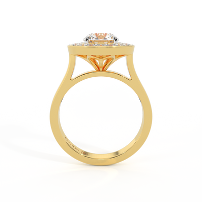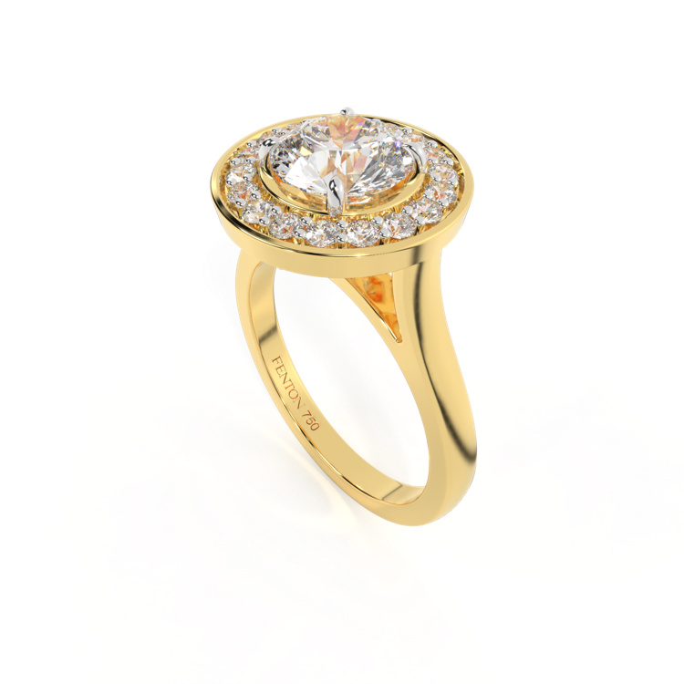 Your sparkling Solar Diamond has a GH V/S quality rating and is framed by a halo of Diamond accent stones and set in bezel style. Your 18K Yellow Gold Solar Diamond center stone sits proudly on wed-fit shoulders to allow your wedding band to sit flush.