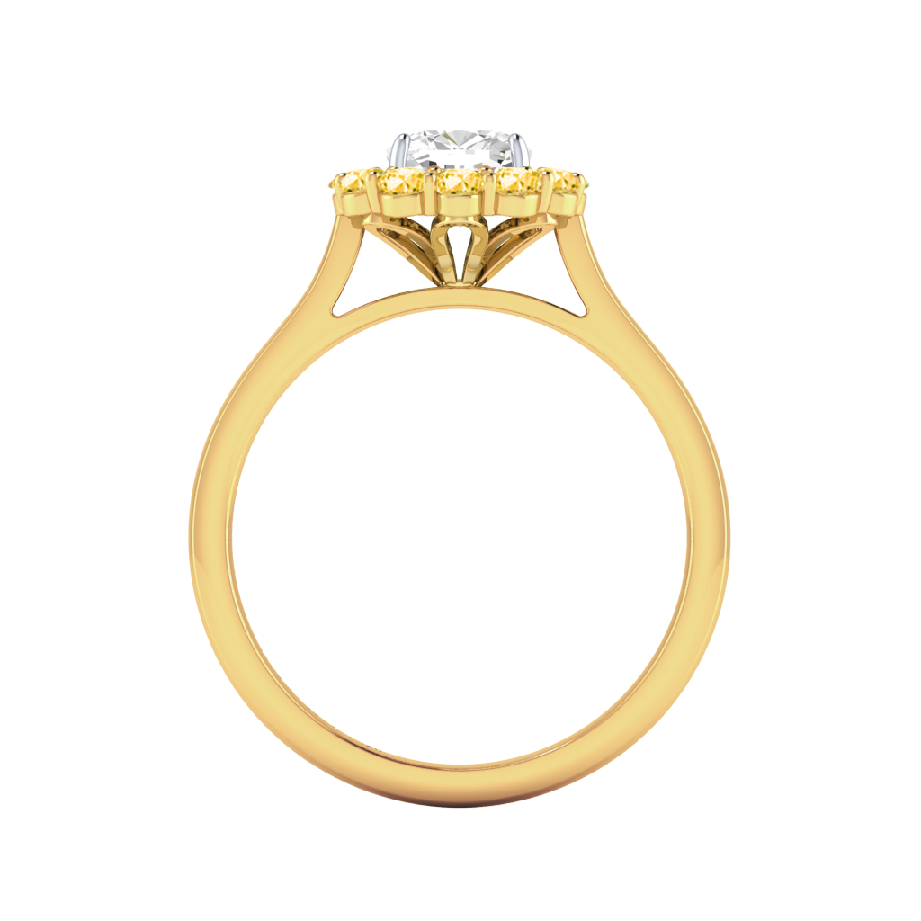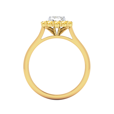 Your glistening Cushion Solar Diamond has a GH V/S quality rating and is framed on either side by a trefoil cluster of three 1.8mm round brilliant cut Yellow Sapphire stones, each securely held into place in a claw setting. The design draws the eye to the glistening Solar Diamond center stone, sitting proudly in a classic open gallery setting crafted from solid 18K Yellow Gold. The open setting of this design allows the light to reflect in all directions, creating a lustrous and sparkling look.