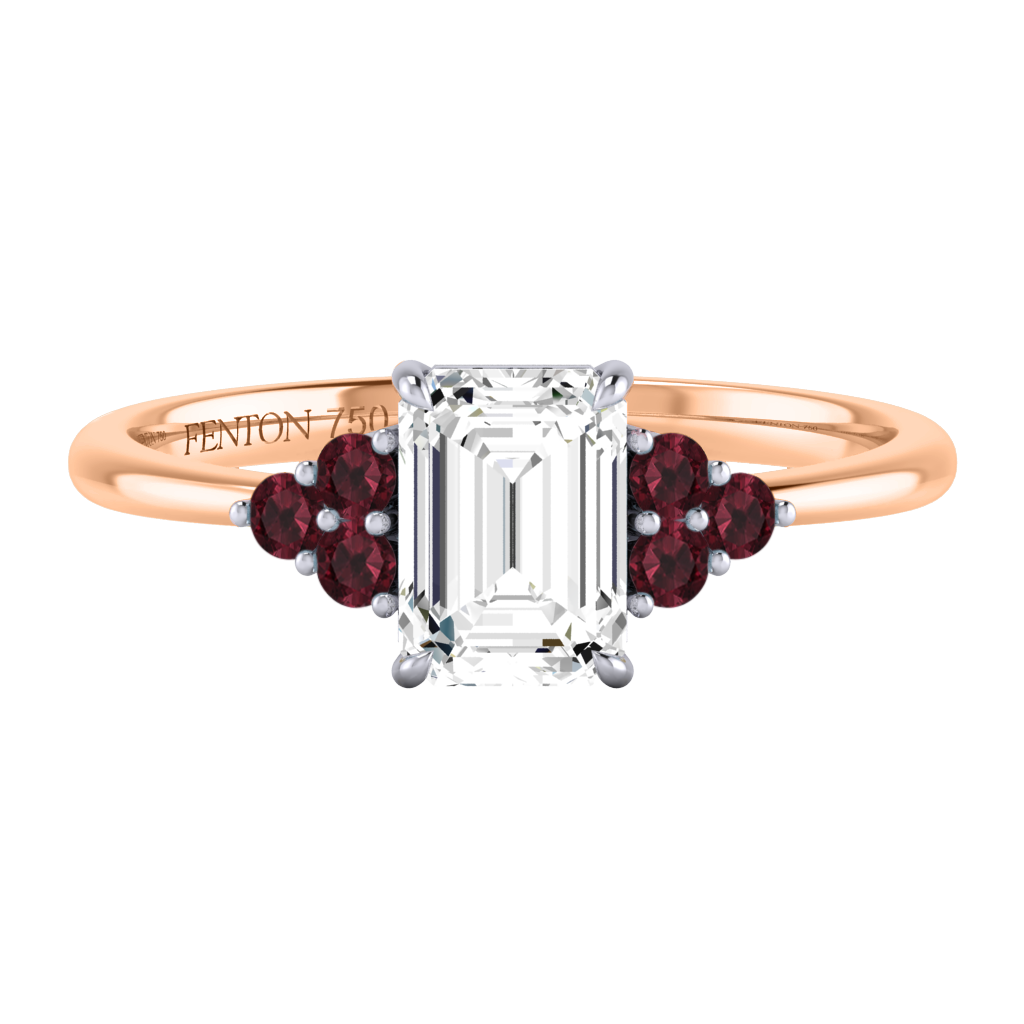 Your glistening Emerald Solar Diamond has a GH V/S quality rating and is framed on either side by a trefoil cluster of three 1.8mm round brilliant cut Garnet stones, each securely held into place in a claw setting. The design draws the eye to the glistening Solar Diamond center stone, sitting proudly in a classic open gallery setting crafted from solid 18K Rose Gold. The open setting of this design allows the light to reflect in all directions, creating a lustrous and sparkling look.
