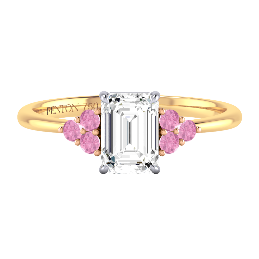 Your glistening Emerald Solar Diamond has a GH V/S quality rating and is framed on either side by a trefoil cluster of three 1.8mm round brilliant cut Pink Sapphire stones, each securely held into place in a claw setting. The design draws the eye to the glistening Solar Diamond center stone, sitting proudly in a classic open gallery setting crafted from solid Platinum. The open setting of this design allows the light to reflect in all directions, creating a lustrous and sparkling look.
