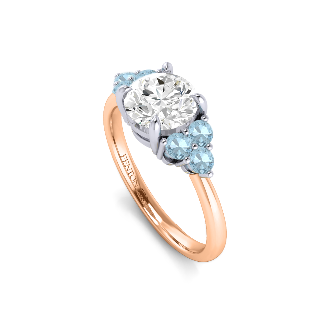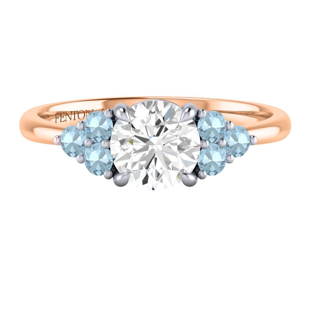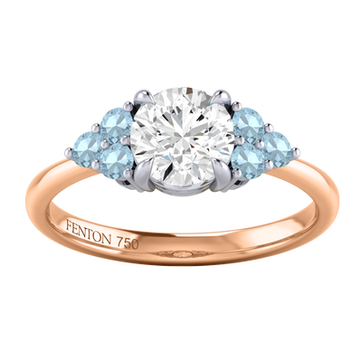 Your glistening Round Solar Diamond has a GH V/S quality rating and is framed on either side by a trefoil cluster of three 1.8mm round brilliant cut Aquamarine stones, each securely held into place in a claw setting. The design draws the eye to the glistening Solar Diamond center stone, sitting proudly in a classic open gallery setting crafted from solid 18K Rose Gold. The open setting of this design allows the light to reflect in all directions, creating a lustrous and sparkling look.
