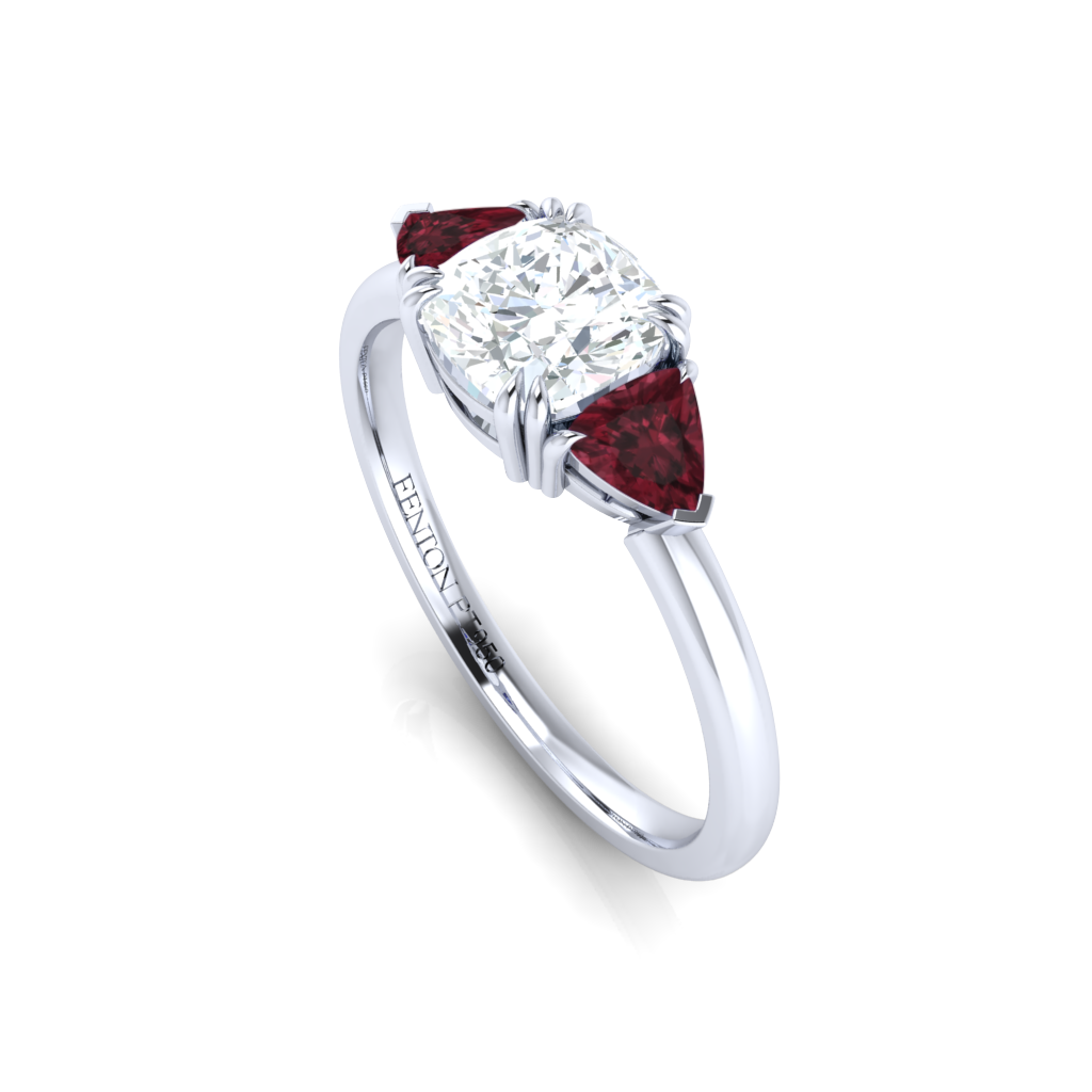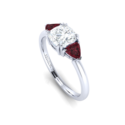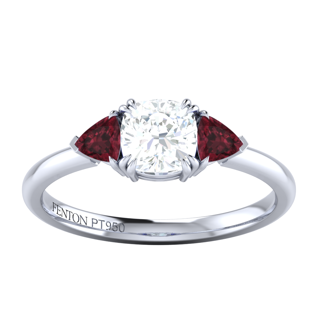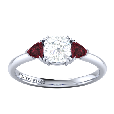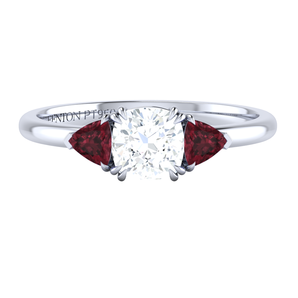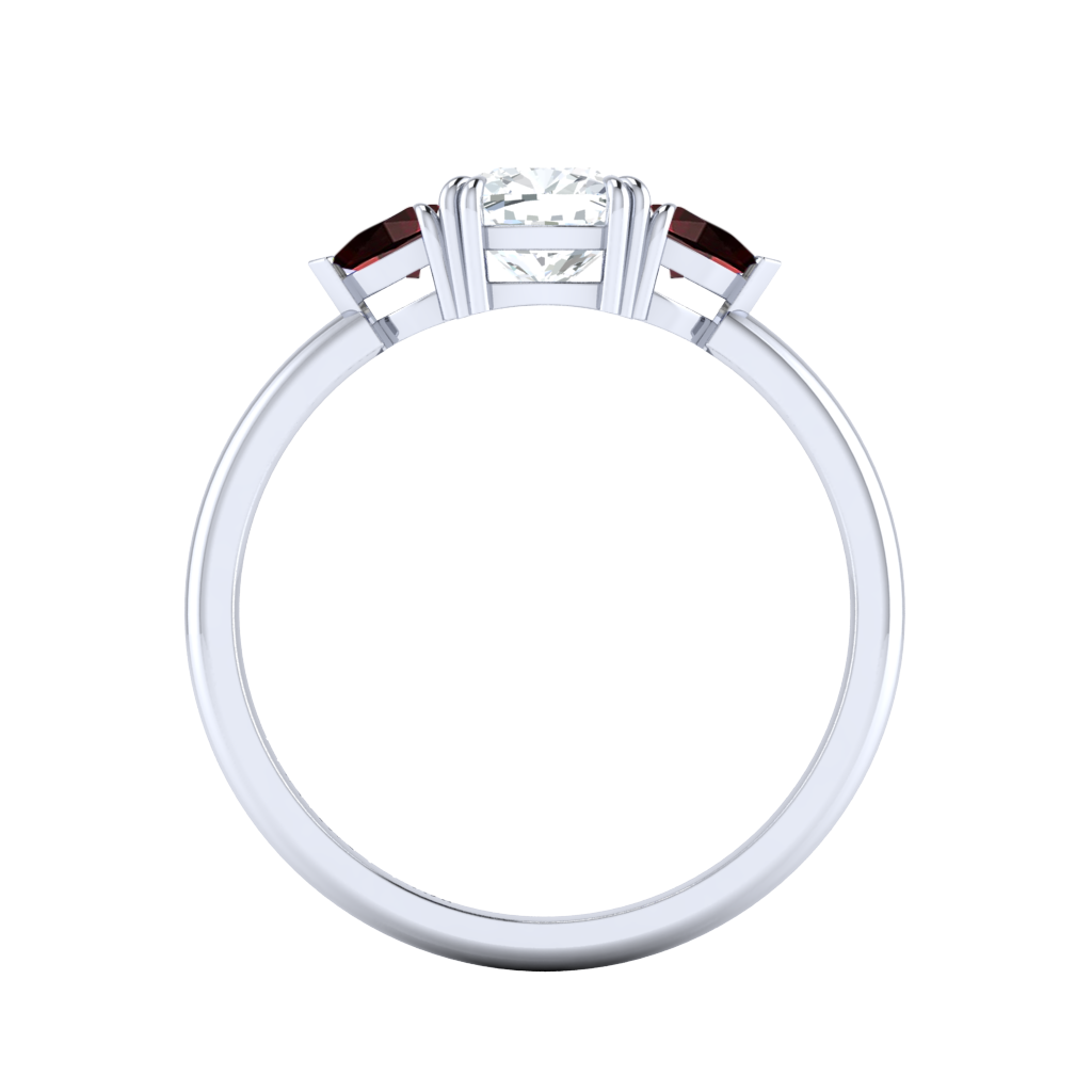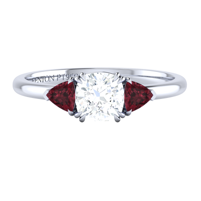 Proof that three isn't always a crowd, our Solar Diamond Trilogy Ring unites a sparkling Solar Diamond center stone with two surrounding Garnet each set in a secure four single- or double claw setting and complimenting the exquisite sparkle of your Solar Diamond stone. Your Cushion Solar Diamond stone has a GH V/S quality rating and is set in a simple yet elegant gallery feeding smoothly into a sleek and simple Platinum band ranging from 1.90 - 2.20mm.