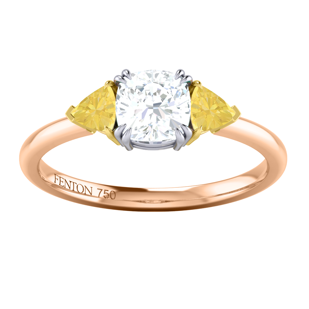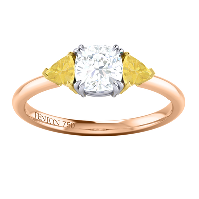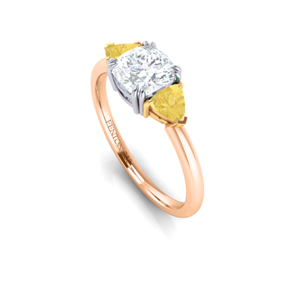 Proof that three isn't always a crowd, our Solar Diamond Trilogy Ring unites a sparkling Solar Diamond center stone with two surrounding Yellow Sapphire each set in a secure four single- or double claw setting and complimenting the exquisite sparkle of your Solar Diamond stone. Your Cushion Solar Diamond stone has a GH V/S quality rating and is set in a simple yet elegant gallery feeding smoothly into a sleek and simple 18K Rose Gold band ranging from 1.90 - 2.20mm.