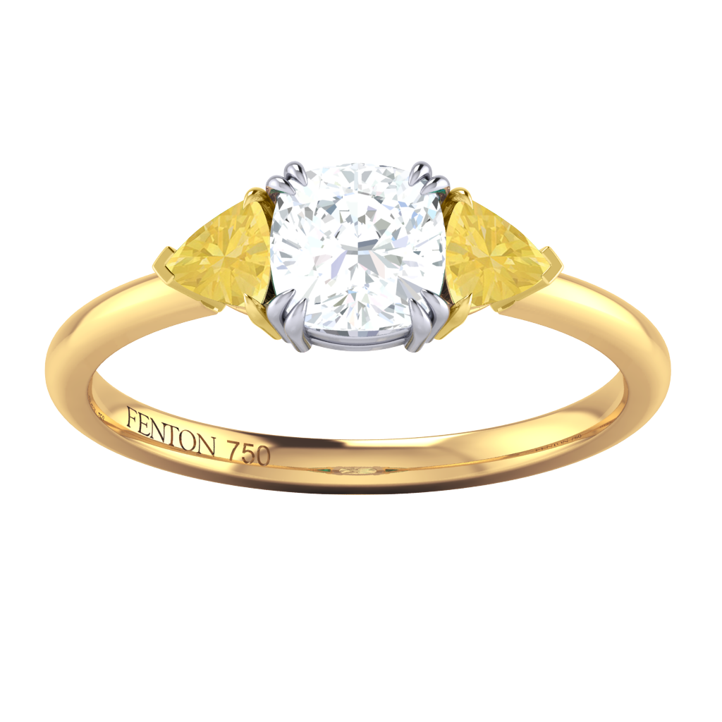 Proof that three isn't always a crowd, our Solar Diamond Trilogy Ring unites a sparkling Solar Diamond center stone with two surrounding Yellow Sapphire each set in a secure four single- or double claw setting and complimenting the exquisite sparkle of your Solar Diamond stone. Your Cushion Solar Diamond stone has a GH V/S quality rating and is set in a simple yet elegant gallery feeding smoothly into a sleek and simple 18K Yellow Gold band ranging from 1.90 - 2.20mm.