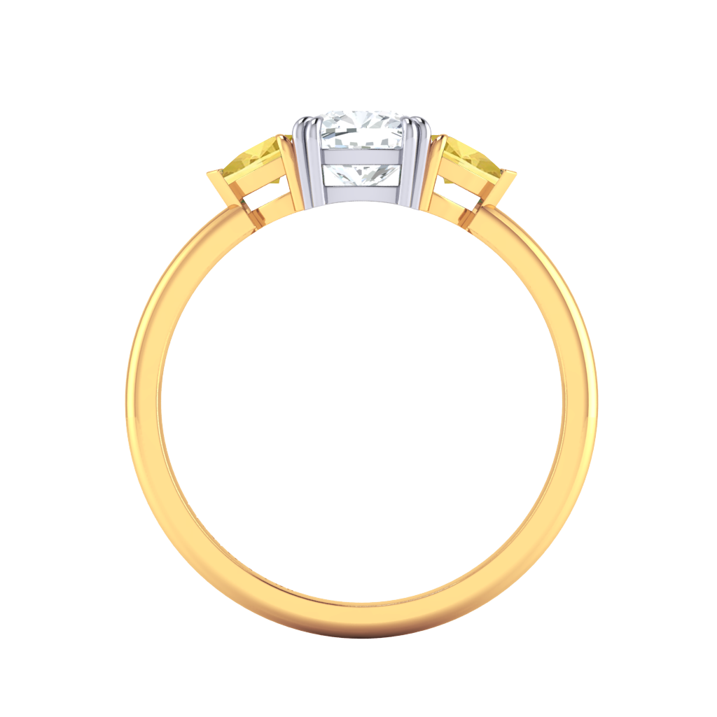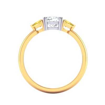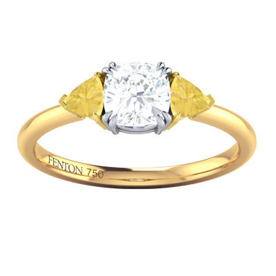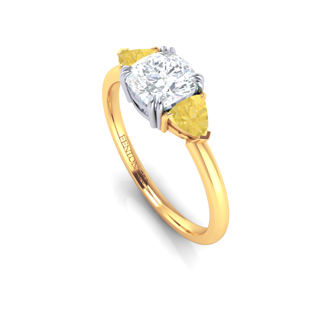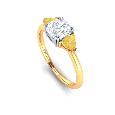 Lab Grown Solar Diamond Trilogy Cushion Cut Diamond and Yellow Sapphire 18k Yellow Gold Ring