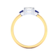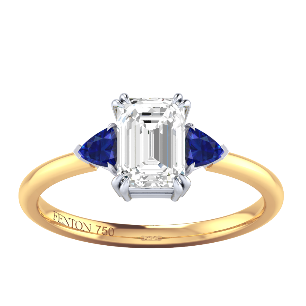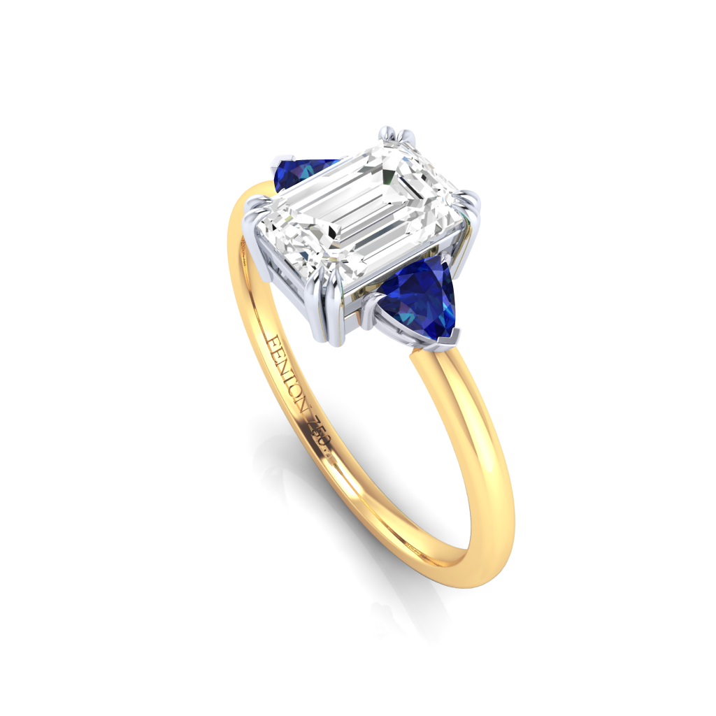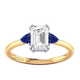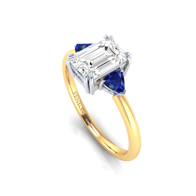 Lab Grown Solar Diamond Trilogy Emerald Cut Diamond and Blue Sapphire 18k Yellow Gold Ring
