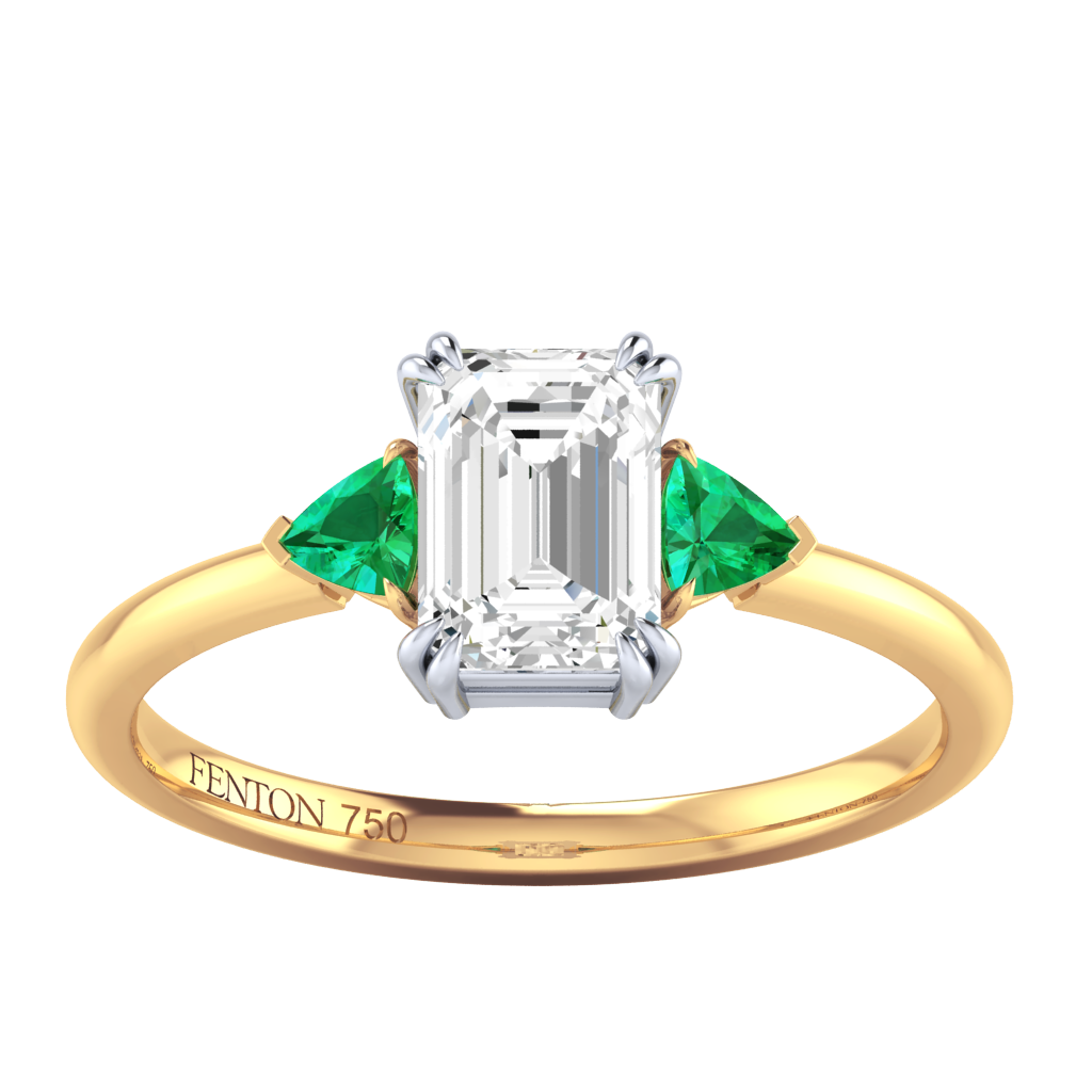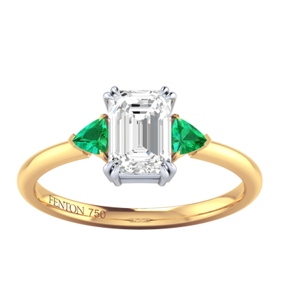 Proof that three isn't always a crowd, our Solar Diamond Trilogy Ring unites a sparkling Solar Diamond center stone with two surrounding Emerald each set in a secure four single- or double claw setting and complimenting the exquisite sparkle of your Solar Diamond stone. Your Emerald Solar Diamond stone has a GH V/S quality rating and is set in a simple yet elegant gallery feeding smoothly into a sleek and simple 18K Yellow Gold band ranging from 1.90 - 2.20mm.