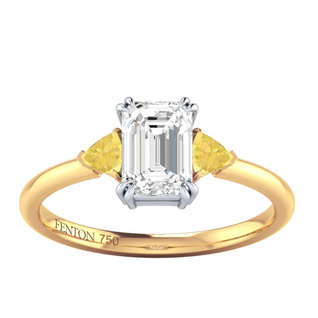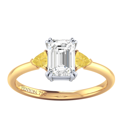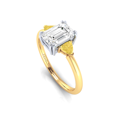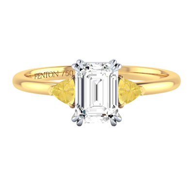 Proof that three isn't always a crowd, our Solar Diamond Trilogy Ring unites a sparkling Solar Diamond center stone with two surrounding Yellow Sapphire each set in a secure four single- or double claw setting and complimenting the exquisite sparkle of your Solar Diamond stone. Your Emerald Solar Diamond stone has a GH V/S quality rating and is set in a simple yet elegant gallery feeding smoothly into a sleek and simple 18K Yellow Gold band ranging from 1.90 - 2.20mm.