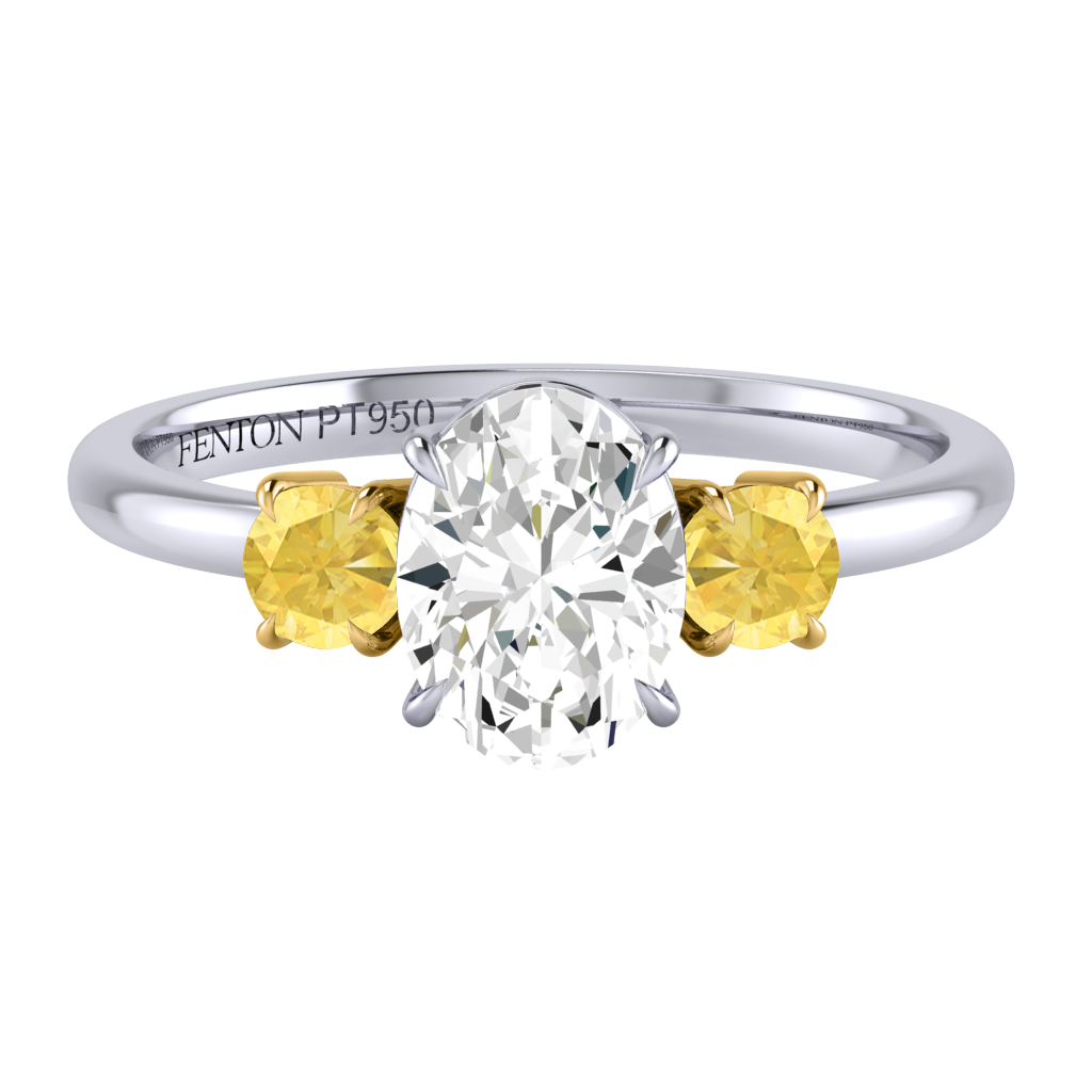 Proof that three isn't always a crowd, our Solar Diamond Trilogy Ring unites a sparkling Solar Diamond center stone with two surrounding Yellow Sapphire each set in a secure four single- or double claw setting and complimenting the exquisite sparkle of your Solar Diamond stone. Your Oval Solar Diamond stone has a GH V/S quality rating and is set in a simple yet elegant gallery feeding smoothly into a sleek and simple 18K Yellow Gold band ranging from 1.90 - 2.20mm.