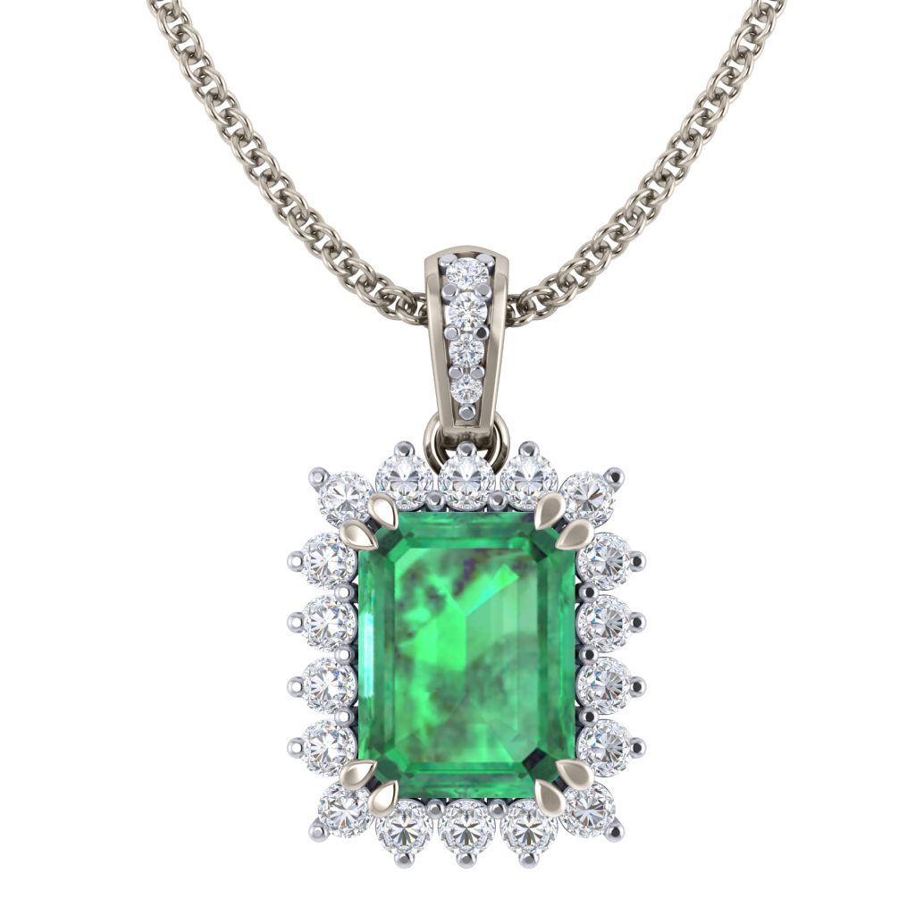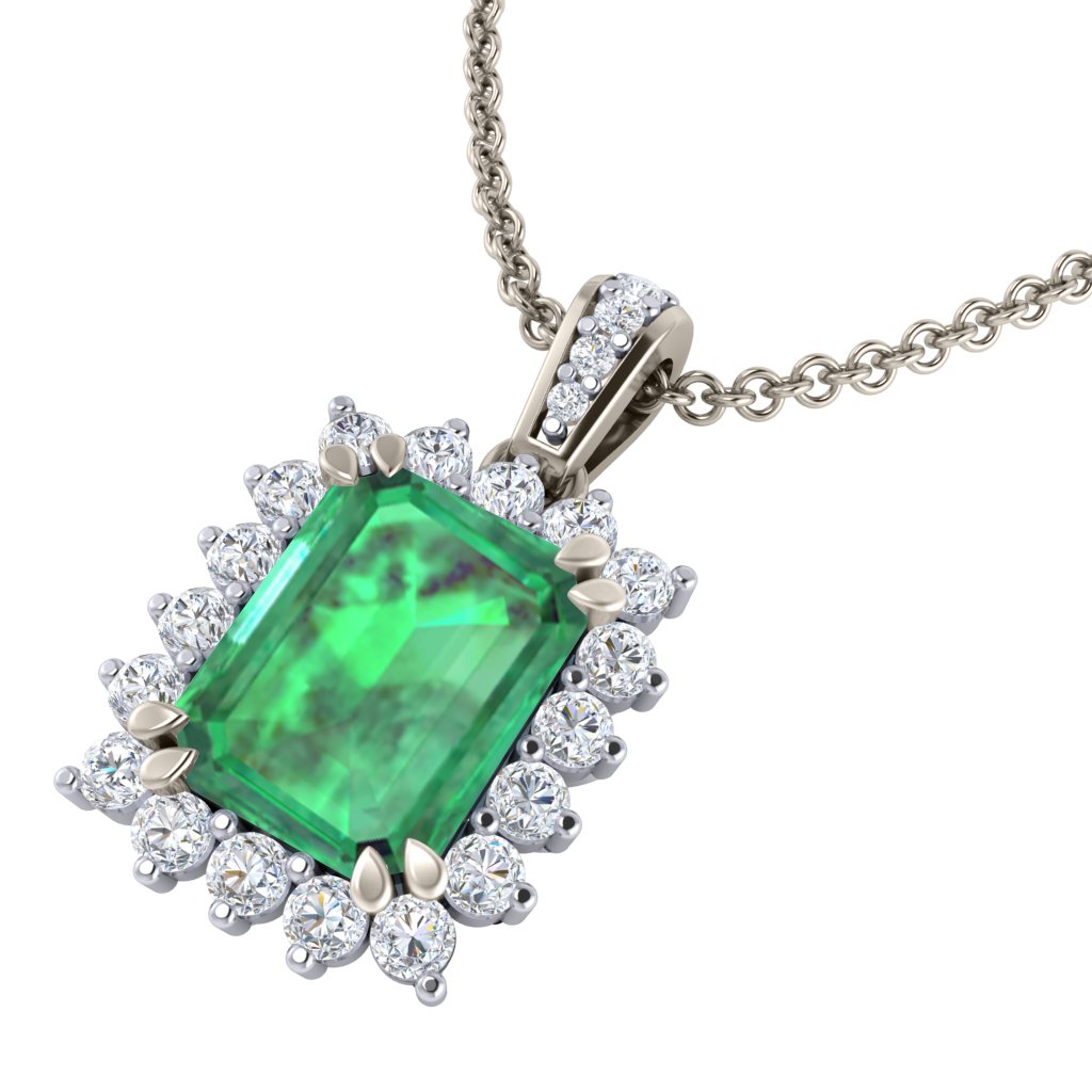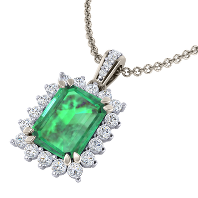 Sparkle from night to day with your Emerald Star Pendant Necklace. This pendant necklace features a single G/H color and VS clarity diamond halo and sparkling diamond-encrusted bale holding your Emerald cut Emerald stone.