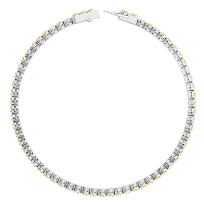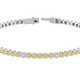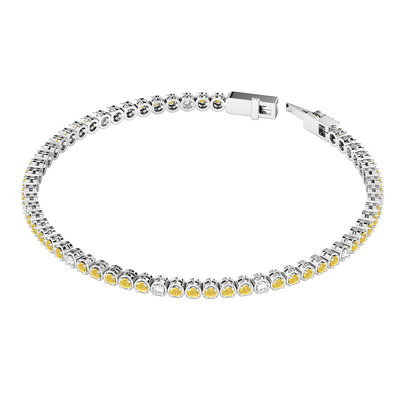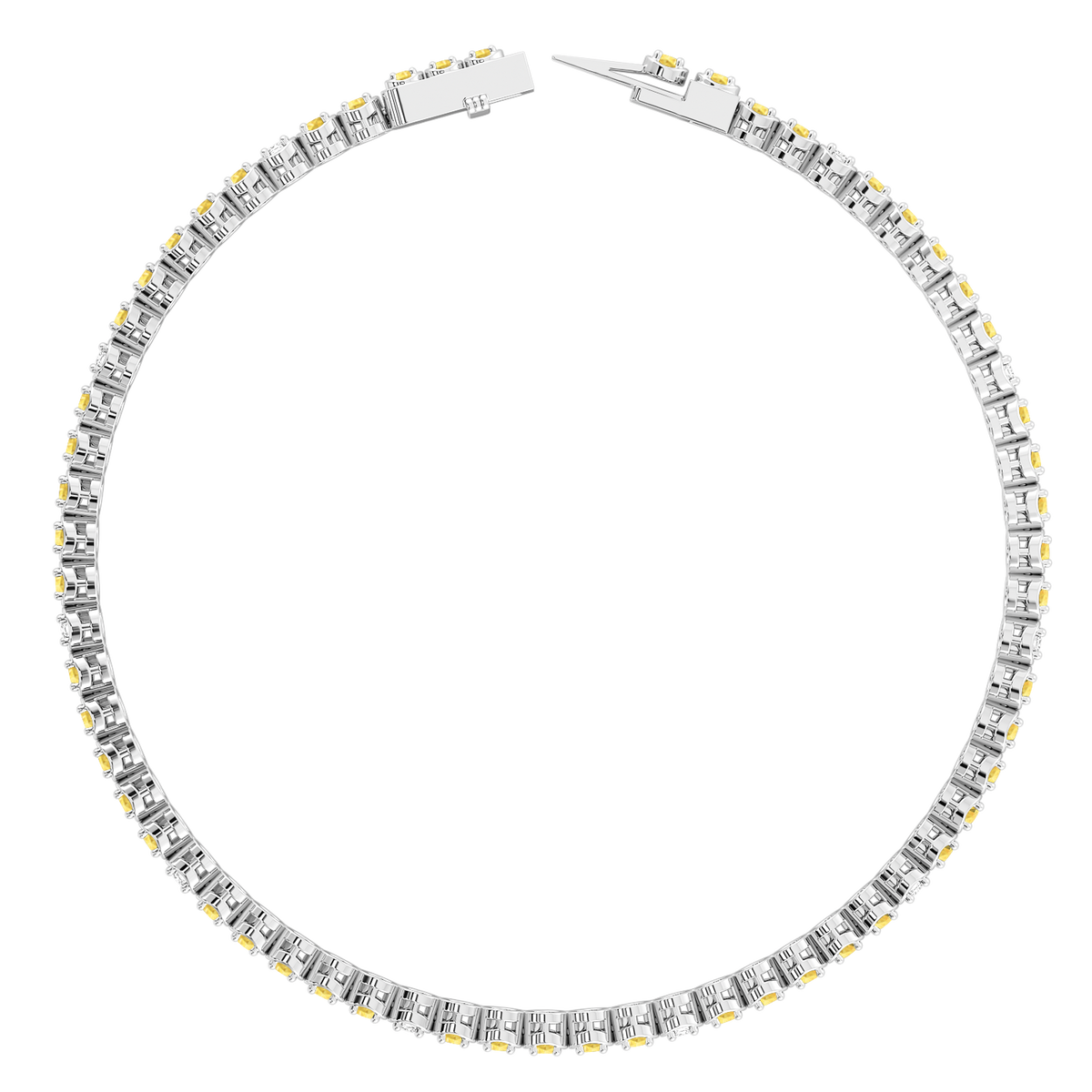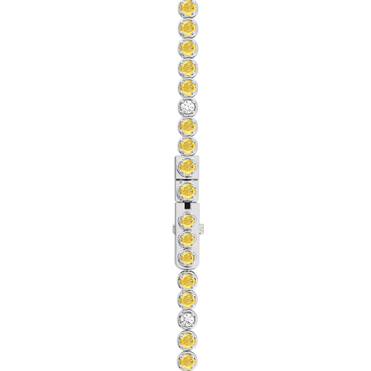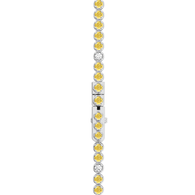 The Tennis Bracelet is the definition of sophisticated and classic style and we have given it a dazzling Fenton finish. Set in recycled, solid 18K White Gold, the glistening stream of Yellow Sapphire gemstones is complimented by ten G/H color and VS clarity diamond accents measuring 1.8mm each and creating a luxurious Jewelry piece to wear every day.