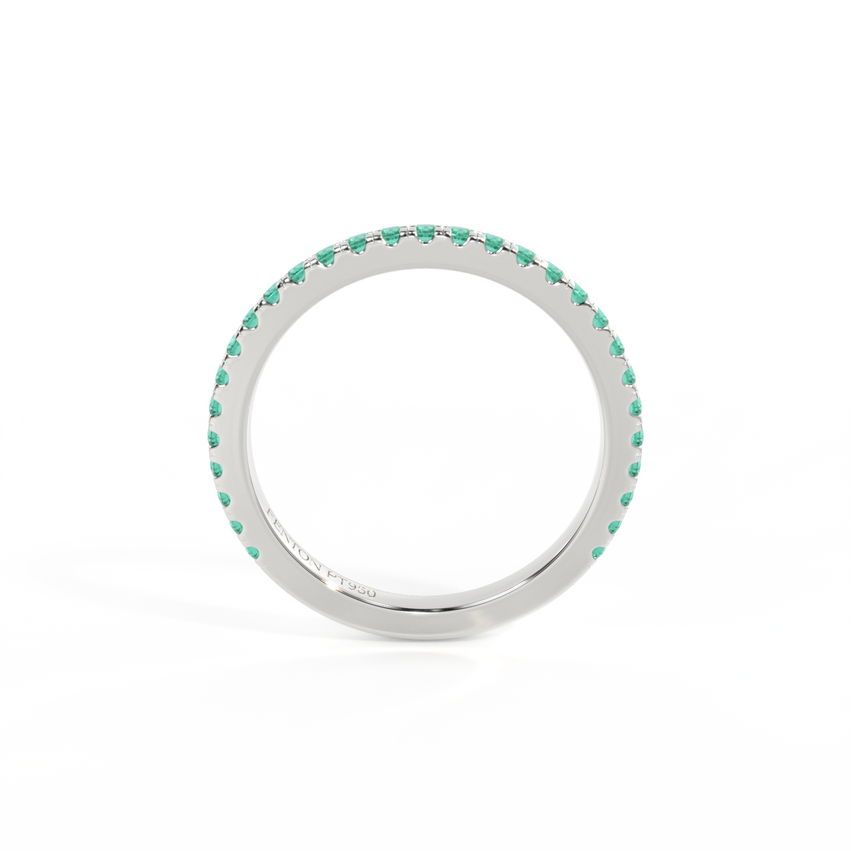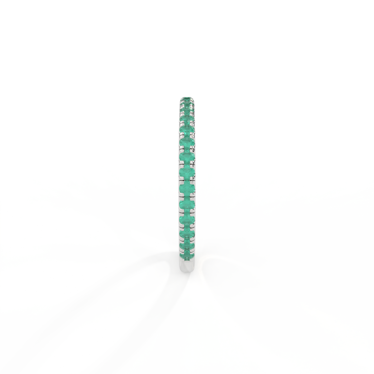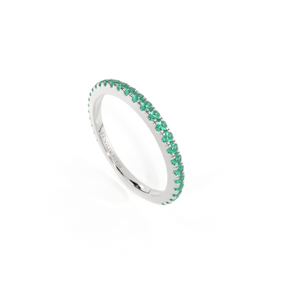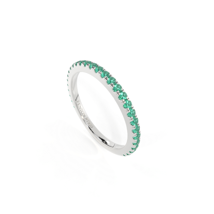 Putting a Fenton twist on a classic, meet the Eternity band in full color. It's a beautiful ring worn solo or as a classic wedding band, stacked with your engagement ring. The Eternity band glistens with a string of round brilliant-cut Emerald stones and five G/H color and VS clarity diamond accents for excellent brilliance. For extra comfort and durability, your stones cover 3/4 of your solid 18kt White Gold band.
