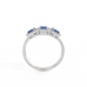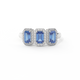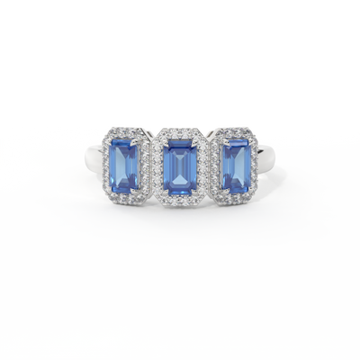 This low set, super wearable beauty, is reminiscent of a floral garland, one of the most universal symbols of love. Three emerald cut Blue Sapphires are surrounded by diamond halos, each sapphire completely unique.