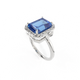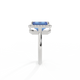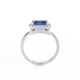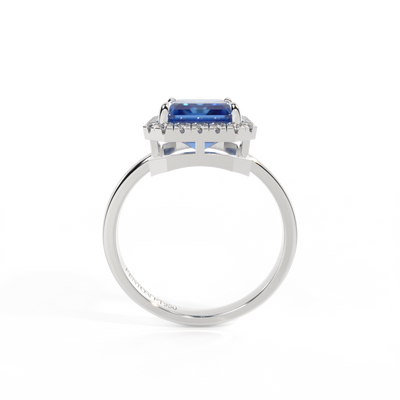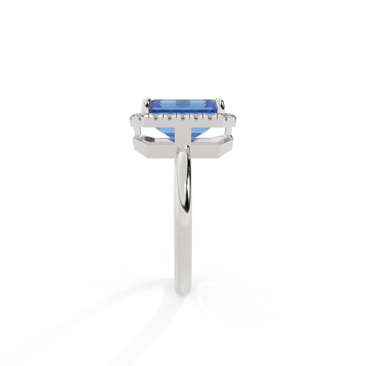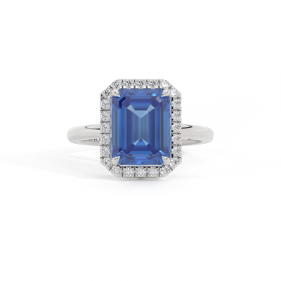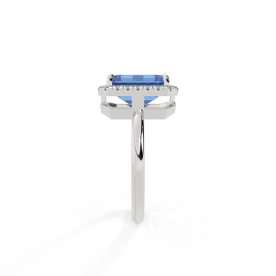 A emerald cut Blue Sapphire with two glistening surround settings of diamonds, make up this one of a kind Halo ring. Handcrafted in platinum with a band of micro pave GH VS diamonds, this piece will never fail to make a statement with a stylish Art Deco edge.