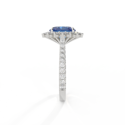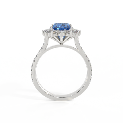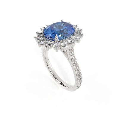 This classic design features a single GH VS diamond halo around an Oval cut Blue Sapphire. The outer three claw setting in Platinum is what gives this design the elegant ‘star’ aesthetic and makes it a real sparkling showstopper.