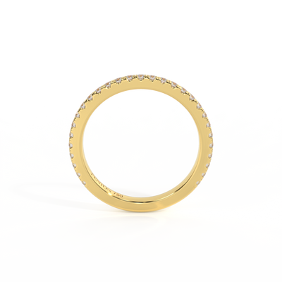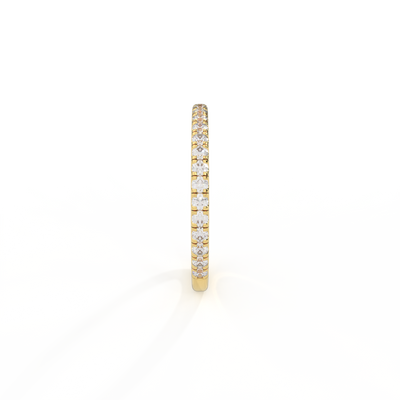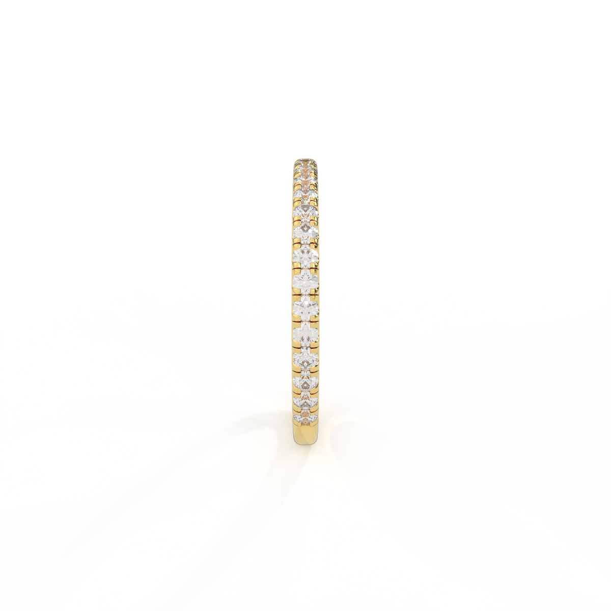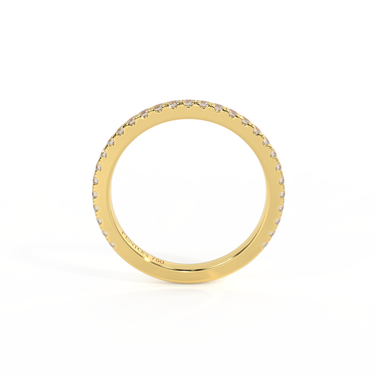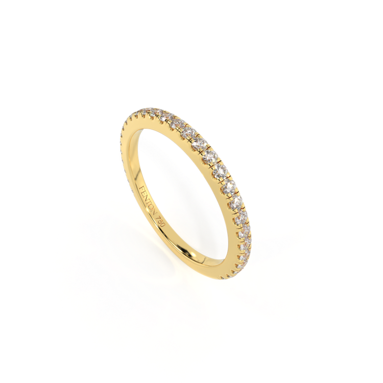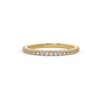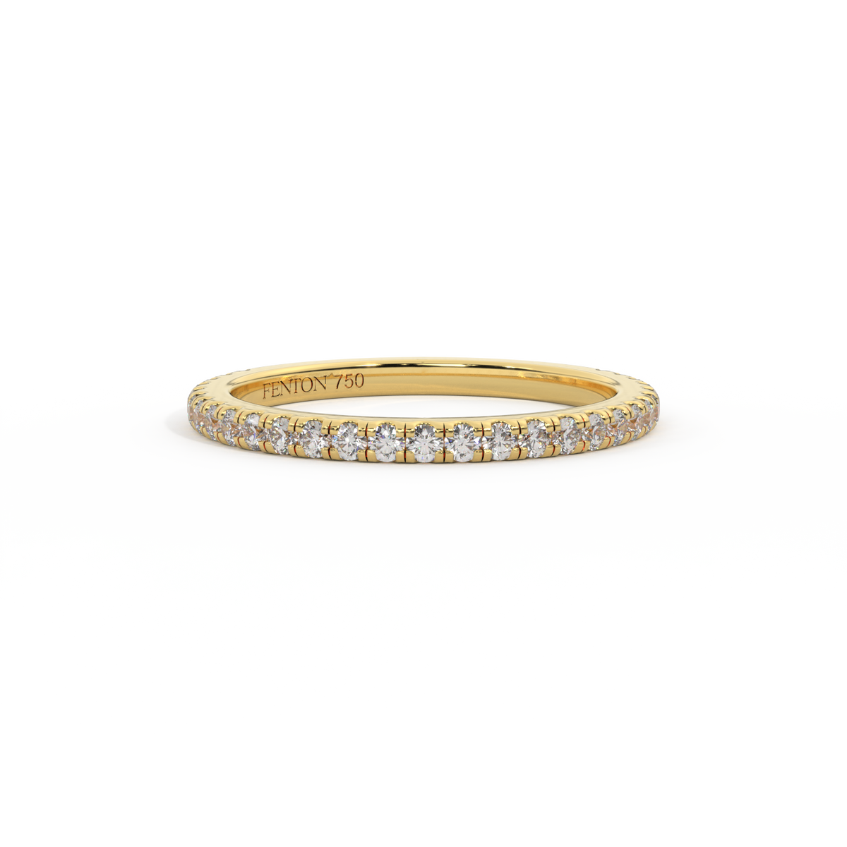 Putting a Fenton twist on a classic, meet the Eternity band in full color. It's a beautiful ring worn solo or as a classic wedding band, stacked with your engagement ring. The Eternity band glistens with a string of round brilliant-cut Emerald stones and five G/H color and VS clarity diamond accents for excellent brilliance. For extra comfort and durability, your stones cover 3/4 of your solid 18K Yellow Gold band.