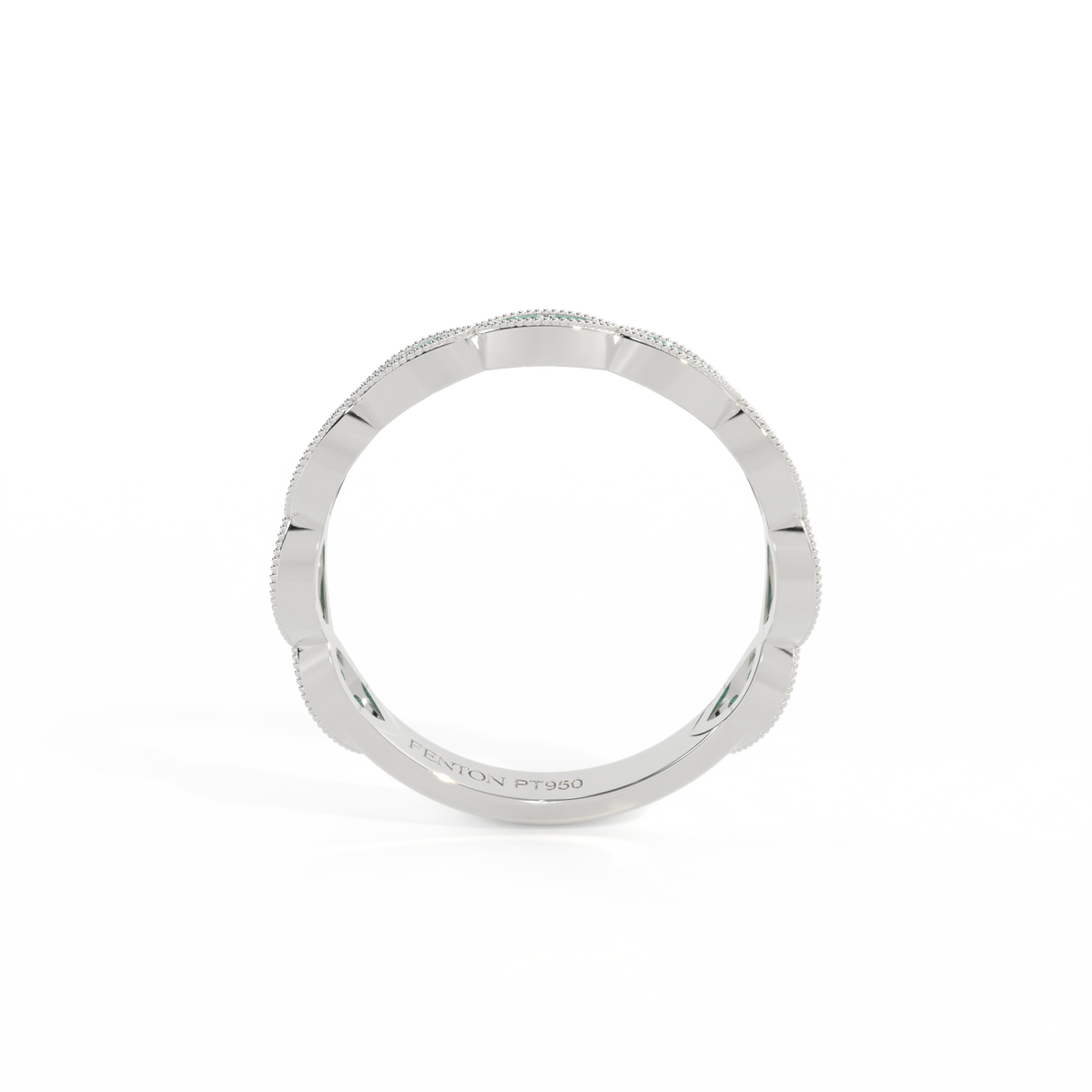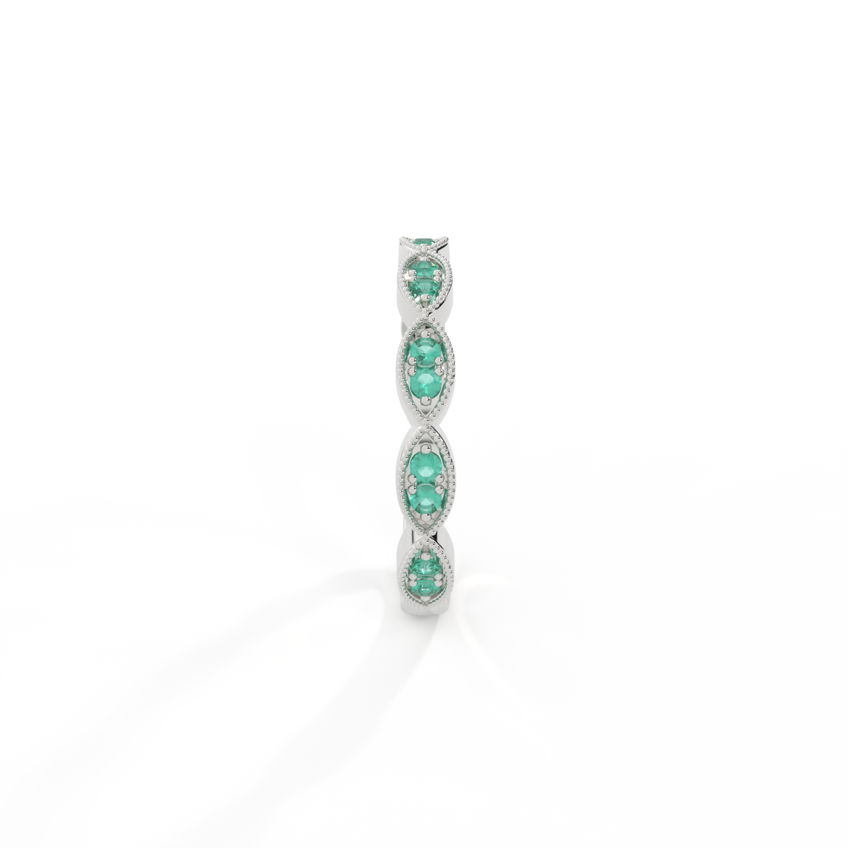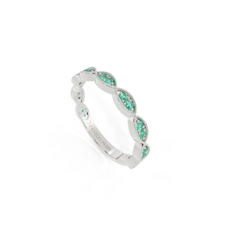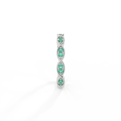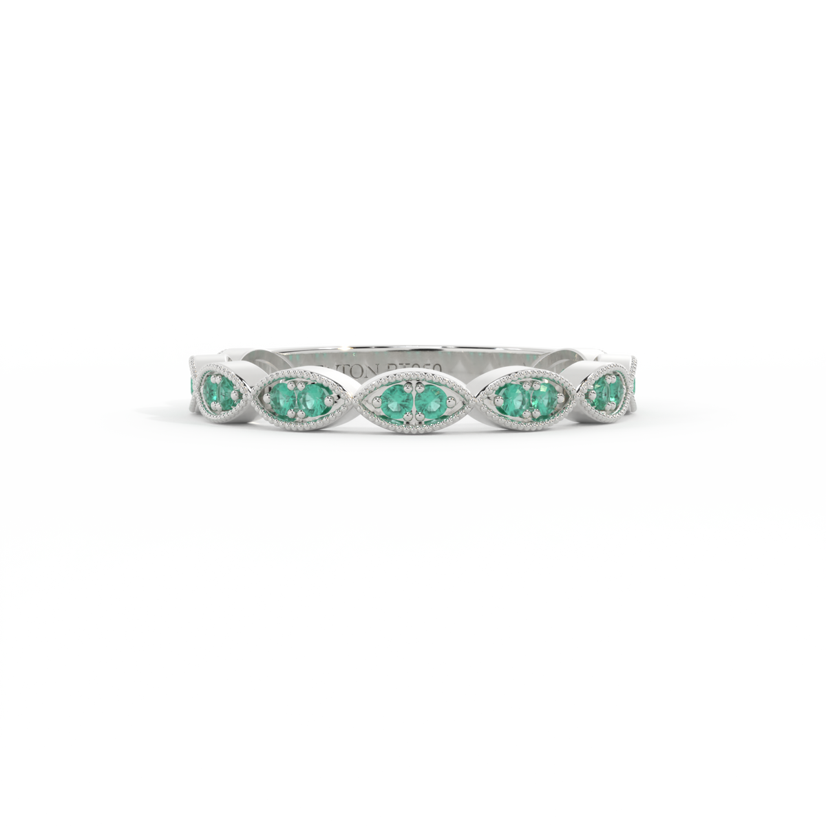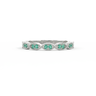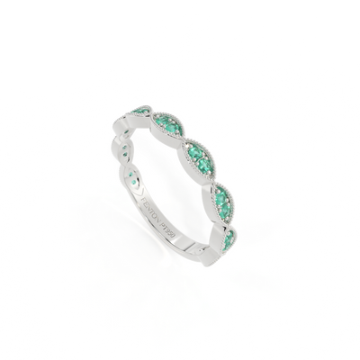 Inspired by the laurel wreaths worn by Roman victors, the Laurel band is a contemporary and playful Jewelry choice to stand out from the crowd. It's a beautiful ring worn solo or as a classic wedding ring, stacked with your engagement ring. The Laurel band is delicately crafted from solid 18K White Gold holding approximately 0.15cts of round-cut Emerald stones. For extra comfort and durability, your stones cover 3/4 of your your overall band.