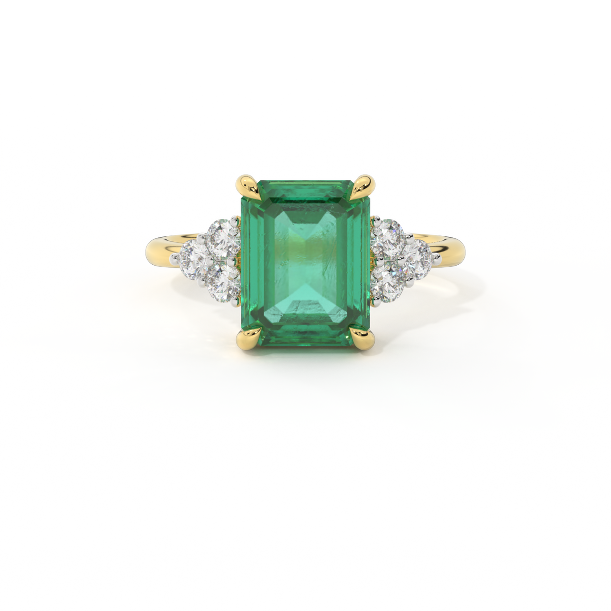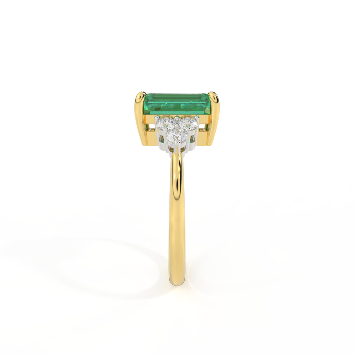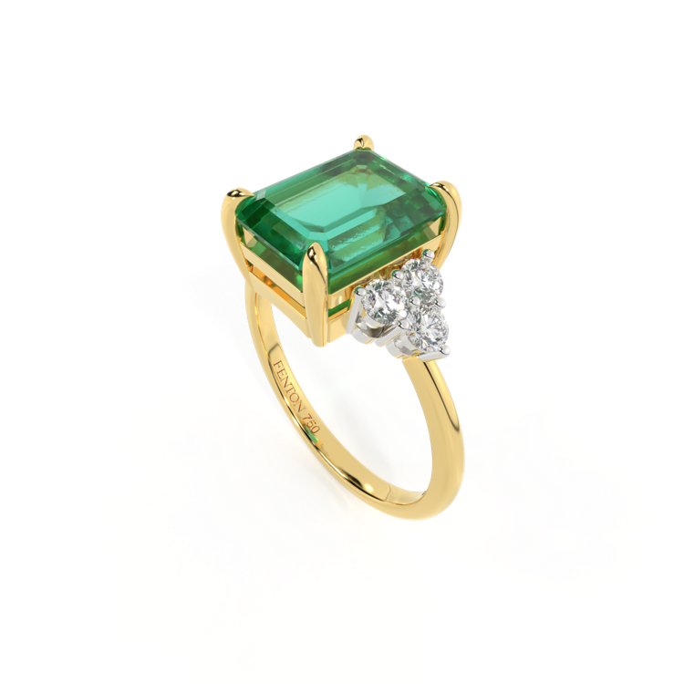 Your glistening Emerald cut Emerald is framed on either side by a trefoil cluster of three 1.8mm round brilliant cut GH/VS diamonds, each securely held into place in a claw setting. The design draws the eye to the glistening Emerald center stone, sitting proudly in a classic open gallery setting crafted from solid, recycled 18K gold or platinum. The open setting of this design allows the light to reflect in all directions, creating a lustrous and sparkling look.