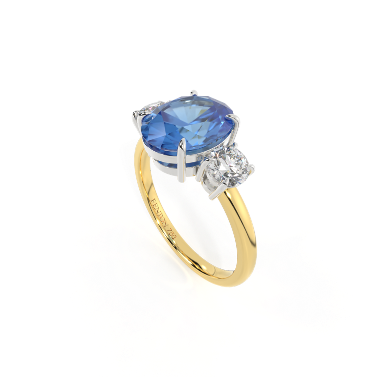 An exceptional Blue Sapphire is a one of a kind gemstone has been hand selected for its high quality through our ethical supply chain, as with all Fenton gemstones. The setting is handcrafted in 18K Yellow Gold, with two round GH VS diamonds, representing the past, present and future.