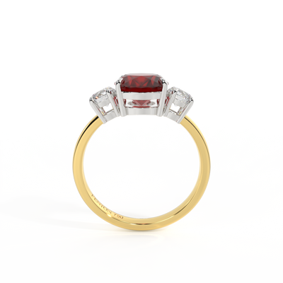 All of our rings are available in blue sapphire, ruby, emerald, pink sapphire, yellow sapphire, garnet and aquamarine. We offer three metals, 18K rose gold, 18K yellow gold and platinum. The center stones are available in four cuts, round, cushion, oval and emerald cut and five sizes for each cut and style.