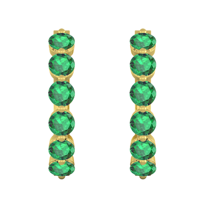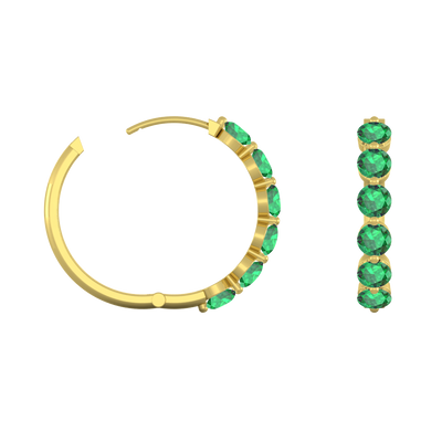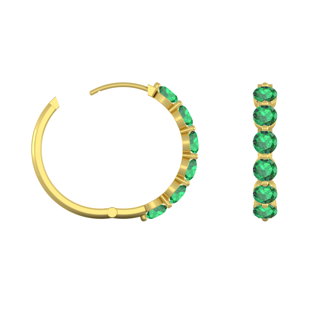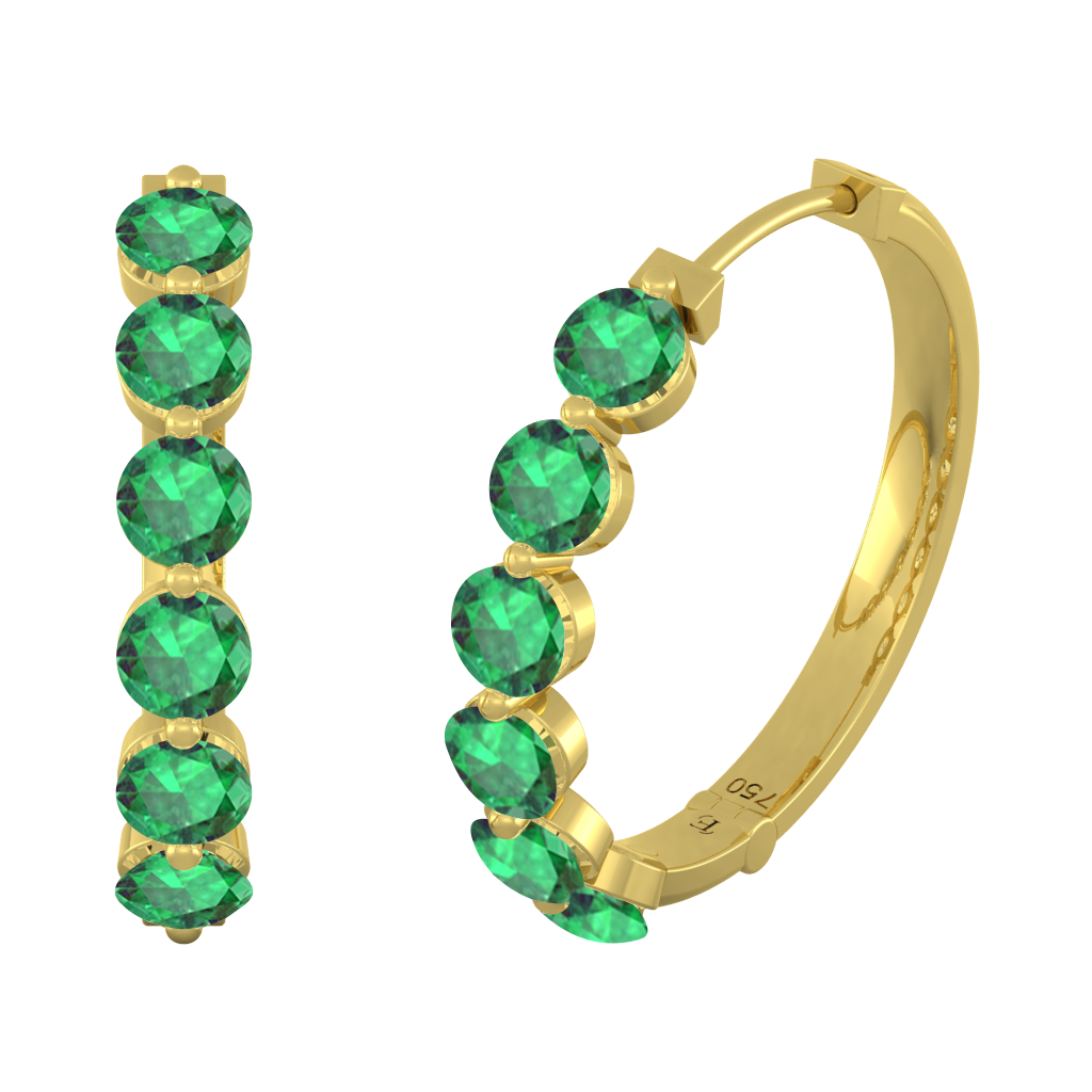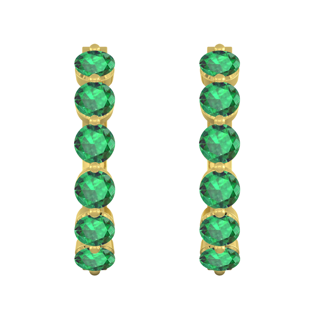 Named the Roman goddess Venus, goddess of love, beauty and desire, The Venus Hoop Earrings sparkle with a total of 6 3mm round-cut {{stones}} on each hoop earring matching the number 6 associated with the goddess and her planet. This design belongs to our more exquisite earring styles. Each hoop earring is crafted using solid {{meta}} and half-set to ensure your sparkling Emerald stones stand in the spotlight of this special Jewelry piece. The Venus Hoops Earrings are secured with a comfortable hinge setting at the base of the hoop adding to the elegance and lightness of the design - perfect to be worn from day to night.