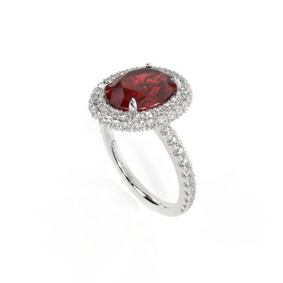 A halo of GH VS diamonds glitter next to the Garnet, set in platinum. As with all Fenton gemstones, this completely unique stone is hand selected through our ethical supply chain.