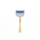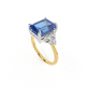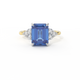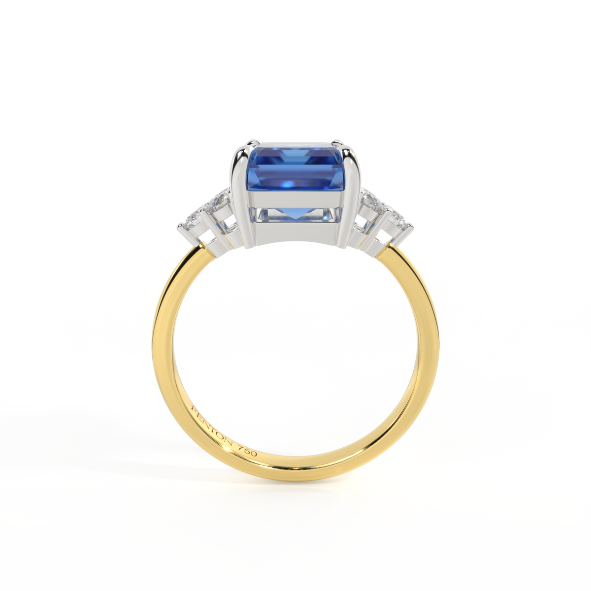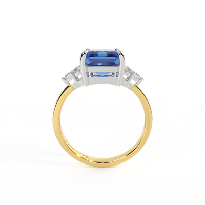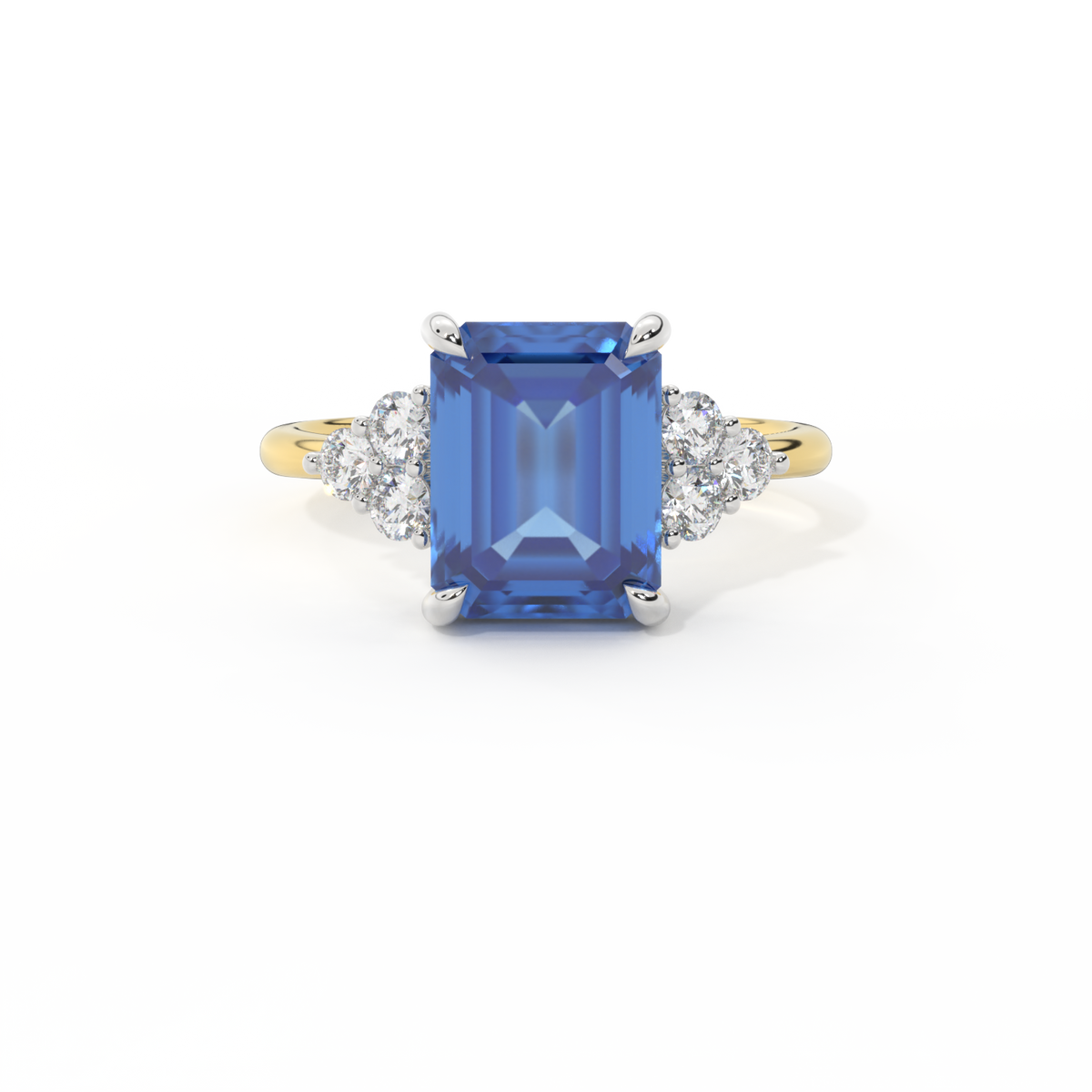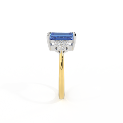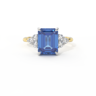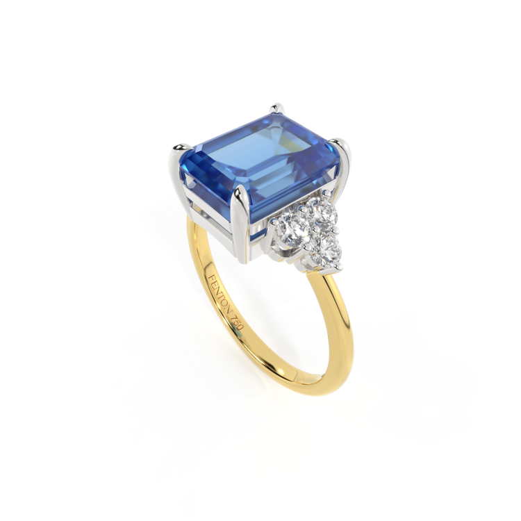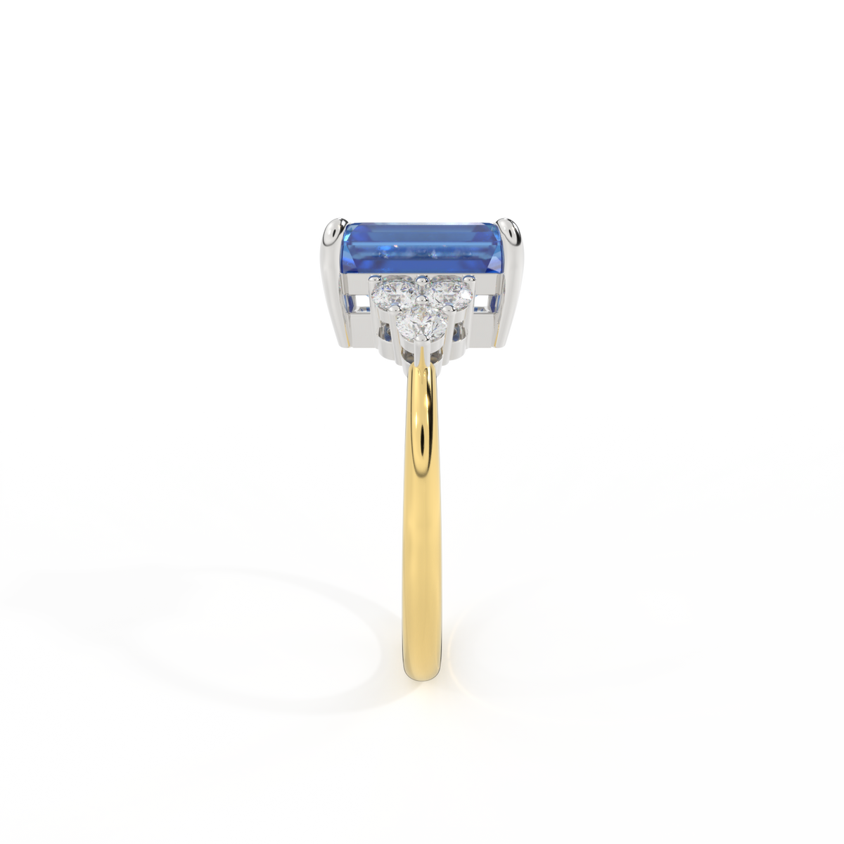 Your glistening Emerald cut Blue Sapphire is framed on either side by a trefoil cluster of three 1.8mm round brilliant cut GH/VS diamonds, each securely held into place in a claw setting. The design draws the eye to the glistening Blue Sapphire center stone, sitting proudly in a classic open gallery setting crafted from solid, recycled 18K gold or platinum. The open setting of this design allows the light to reflect in all directions, creating a lustrous and sparkling look.