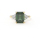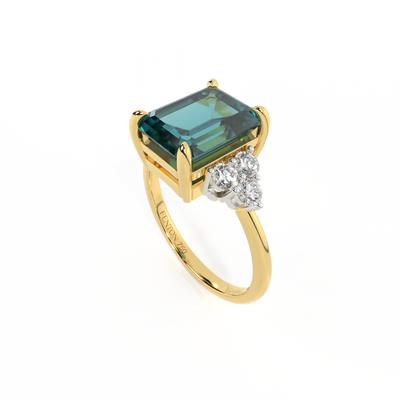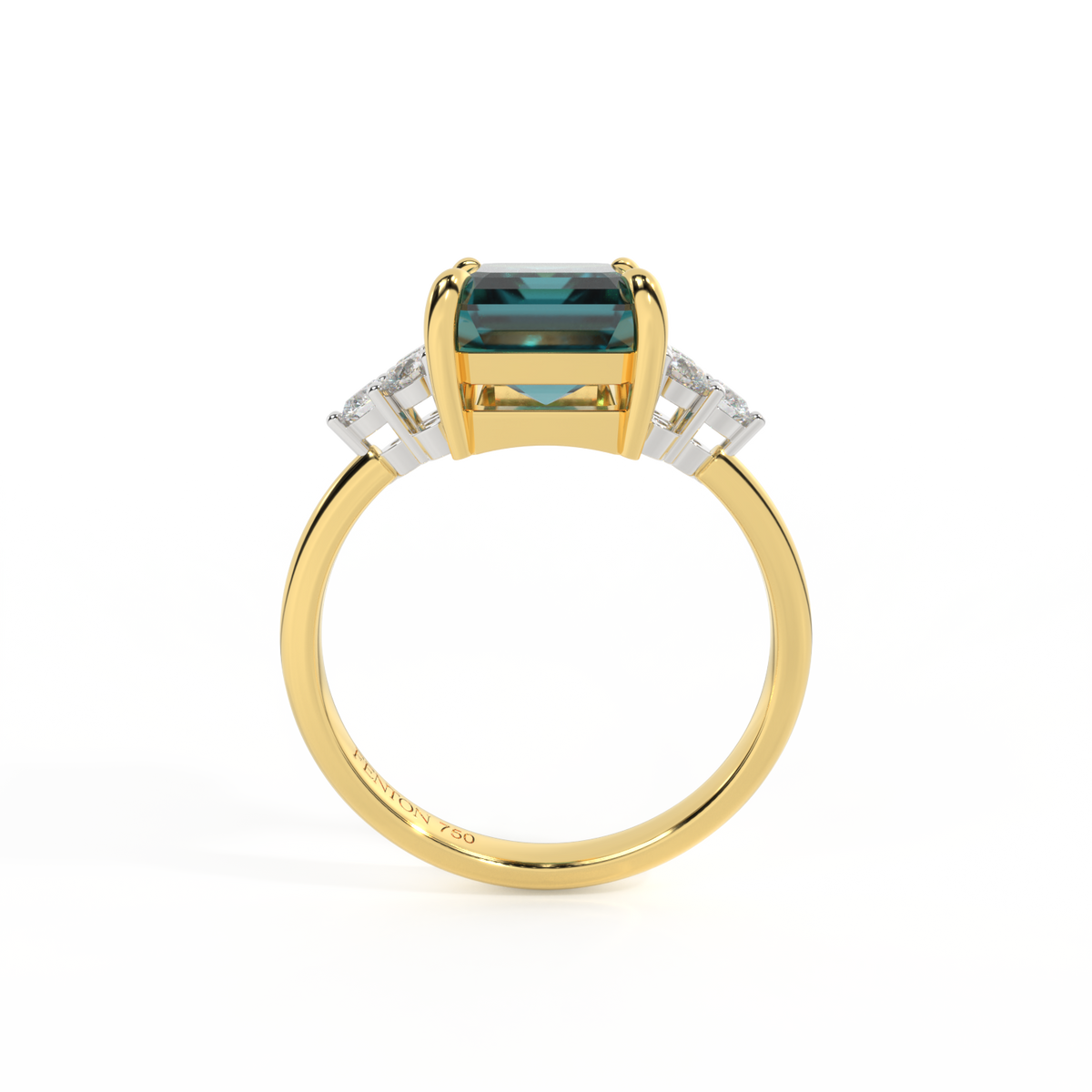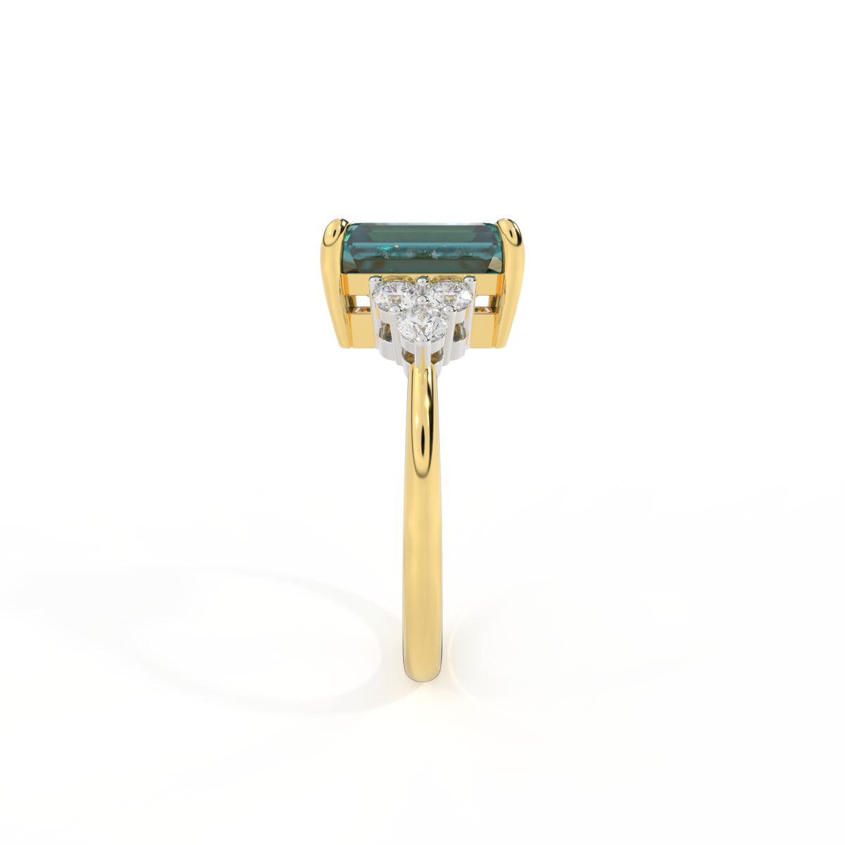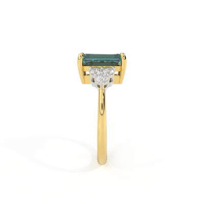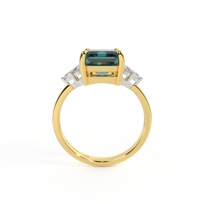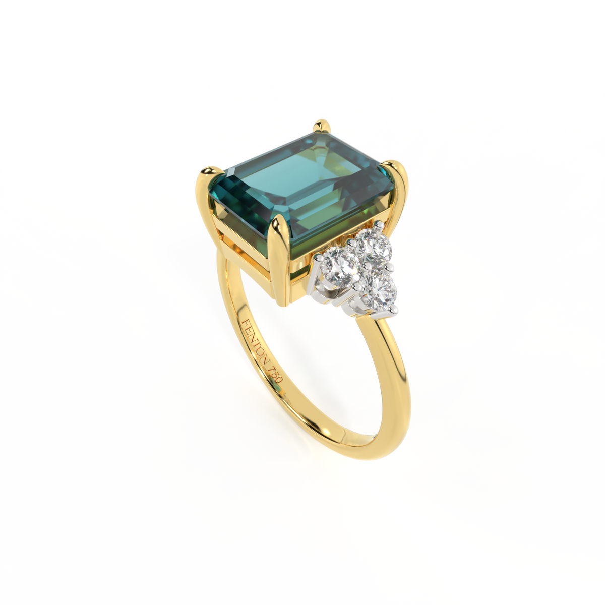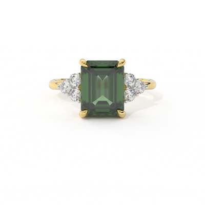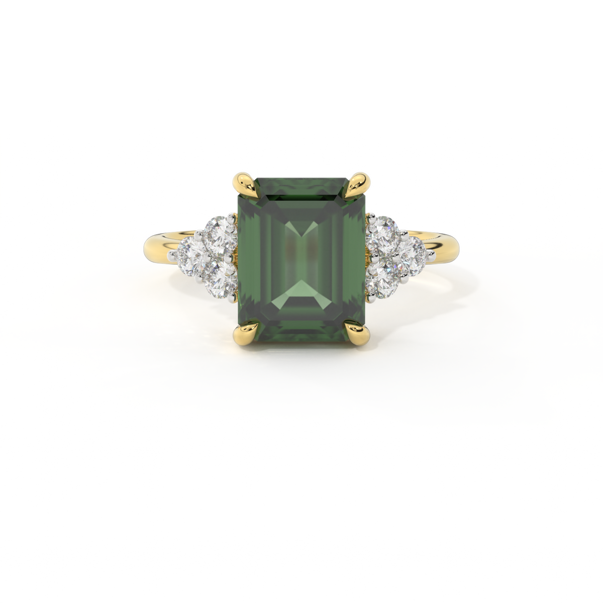 Your glistening Emerald cut Green Sapphire is framed on either side by a trefoil cluster of three 1.8mm round brilliant cut GH/VS diamonds, each securely held into place in a claw setting. The design draws the eye to the glistening Ruby center stone, sitting proudly in a classic open gallery setting crafted from solid, recycled 18K gold or platinum. The open setting of this design allows the light to reflect in all directions, creating a lustrous and sparkling look.